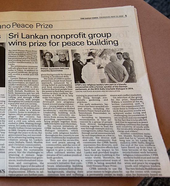 The Centre for Peace Building and Reconciliation was founded in 2002 by Dishani Jayaweera and Jayantha Seneviratne, who are also life partners and Sinhala Buddhists by birth.  The CPBR is a non-profit organization promoting peacebuilding, peace-making and non-violent conflict transformation.  It supports personal and societal transformation within and between ethnic, religious, linguistic and regional communities in Sri Lanka, working at all the grassroots, local and national levels. To achieve goals of national reconciliation, the CPBR focuses those considered to hold the greatest influence and promise for transformation: religious leaders, women, and young people.