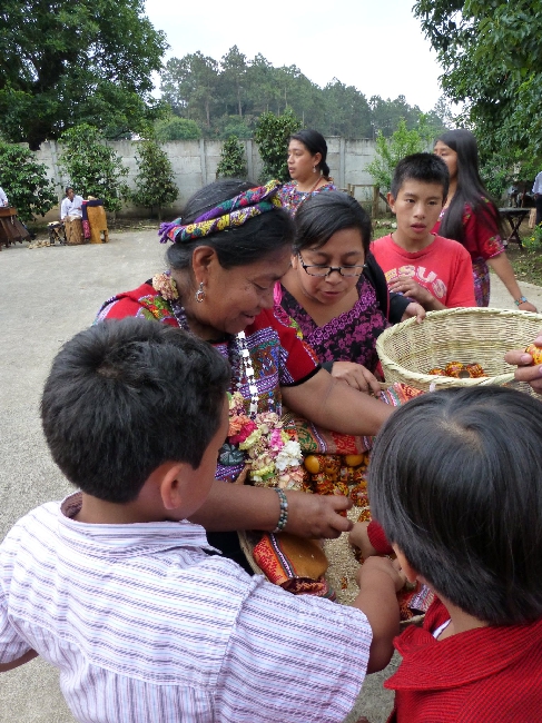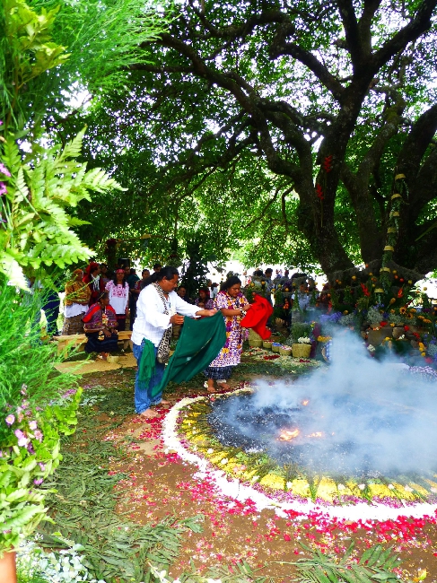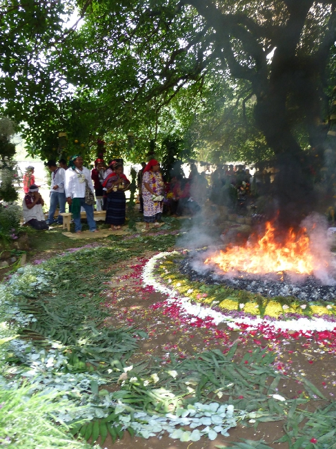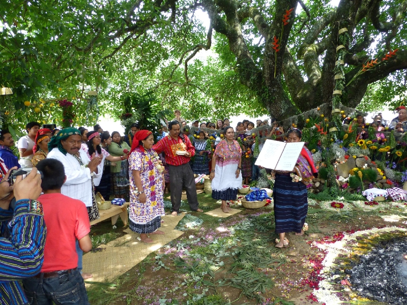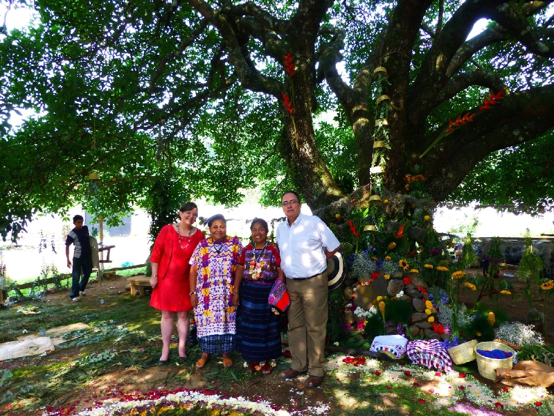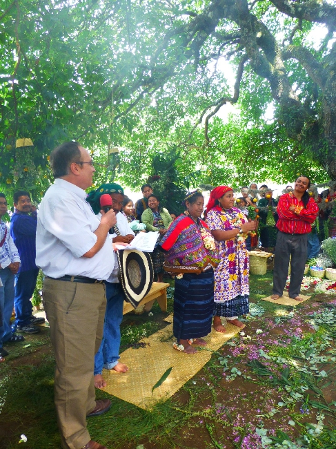 On May 19, at a sacred ceremonial site, Mayan elders and spiritual guides were part of a day-long event that highlighted Rosalina and the Niwano award. The ceremonies were presided over by Mayan Elders – Rosalina is also a spiritual guide so the Niwano Award was a special honor to her and to her community. Around a fire kept alive all day, surrounded by flowers and offerings of fruit, flowers, rice, and other treasured products of nature, the Elders honored Rosalina with prayers and calls to ancestors and Elders. The Niwano citation was read, and the medal and the certificate were carried around the sacred fire. As representatives of the Foundation, Samuel Lobato and I were honored and danced around the fire also. The day ended with a feast and with many hours of dance.