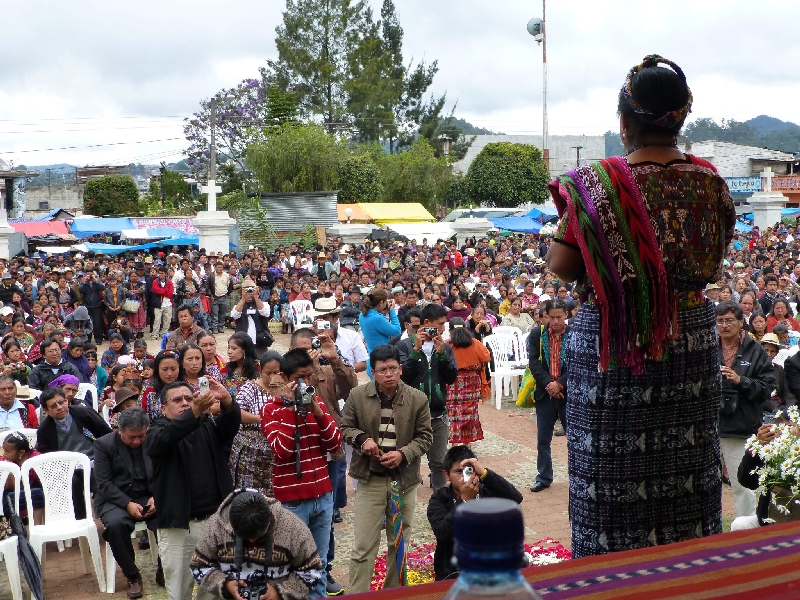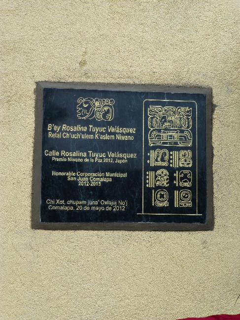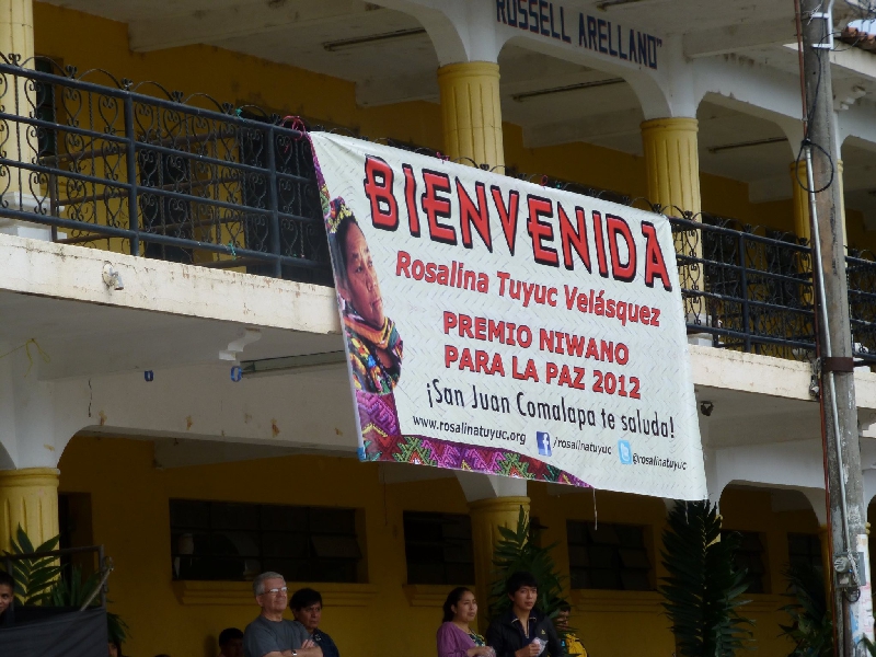 Then on May 20, there was a remarkable public celebration in San Juan Comalapa, Rosalina’s home town. It began with prayers for the many who disappeared and died in the long years of violence in Guatemala. Then a parade led to her home, where her mother was honored, and plaques unveiled with the street’s new name: Rosalina Tuyuc Velasquez avenue. Then at the central public square there was an ecumenical ceremony, with representative of the Catholic and Protestant churches and of the Mayan spiritual community. It was followed by official speeches and commemorations, including Rosalina’s address and appreciation, and reading of the Niwano award citation. The overall theme was peace and harmony and television, radio, and newspapers covered the events.