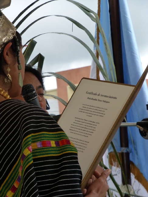 May 21 in the capital city, Guatemala City there was an official celebration. About 250-300 people gathered there, representing a wide spectrum of institutions, including the diplomatic corps and United Nations. Media covered the event and Rosalina’s work for peace was presented as a landmark. In the emotional ceremony, Rosalina received long and warm applause.