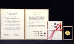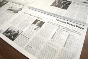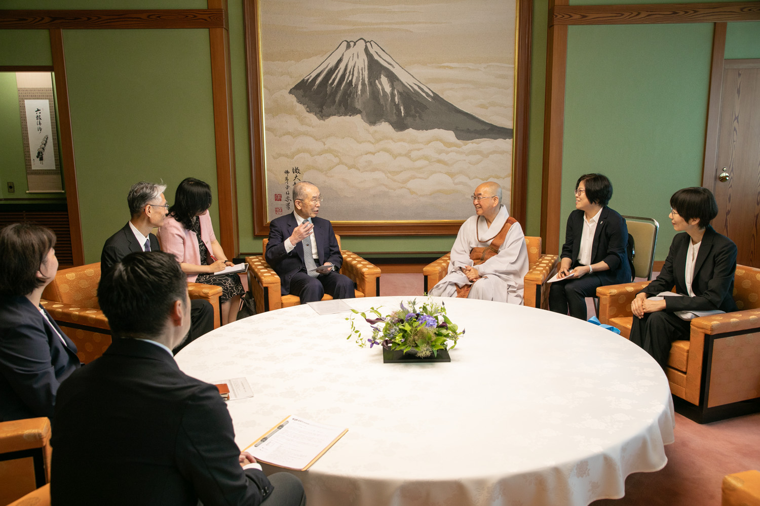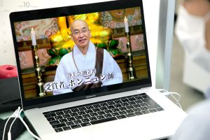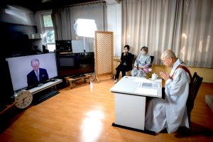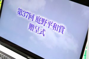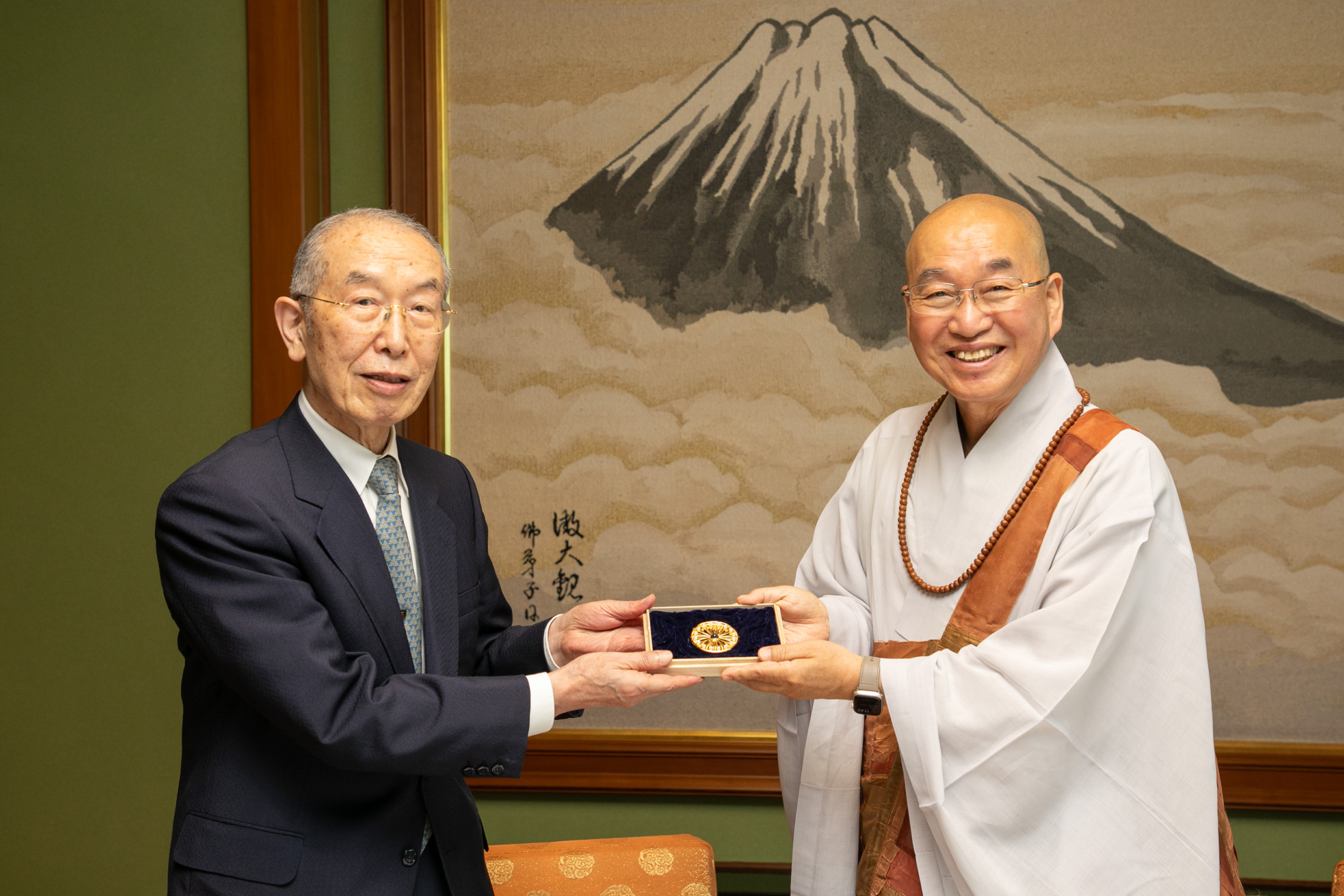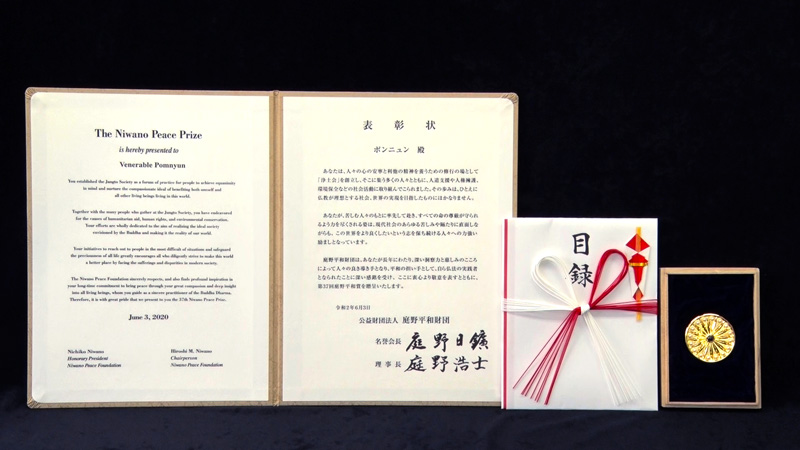 第37回庭野平和賞贈呈式は、世界的な新型コロナウイルス感染拡大のため、2020年10月26日にオンラインで開催されました。受賞記念メダルは、庭野平和財団でお預かりしておりましたが、2024年6月27日、ポンニュン師が立正佼成会を訪問された際、庭野名誉会長より贈呈いたしました。