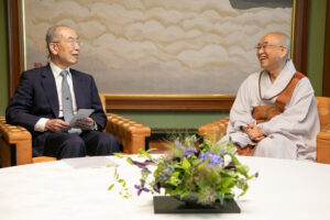 第37回庭野平和賞をポンニュン師に贈呈いたしました。ポンニュン師は、1953年韓国蔚山広域市に生まれ16歳で曹渓宗に出家、35歳で在家仏教教団浄土会を創立します。仏教に説かれる真の浄土を顕すべく、一人ひとりが心の安寧を養い、利他の実践に打ち込める仏道修行の場を提供。その上で、南北統一や北朝鮮への人道的支援、環境に配慮した生活スタイルの提唱など、多岐にわたる活動を展開。その輪は国内外に広がりをみせています。同師の仏教精神に立脚した活動は、さまざまな専門的組織の創設へとつながり、戦争や紛争、自然災害や環境破壊に端を発した現代社会の苦しみのなかにいる人々の救済を実現しています。