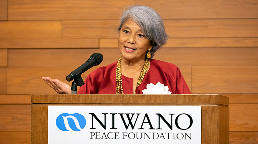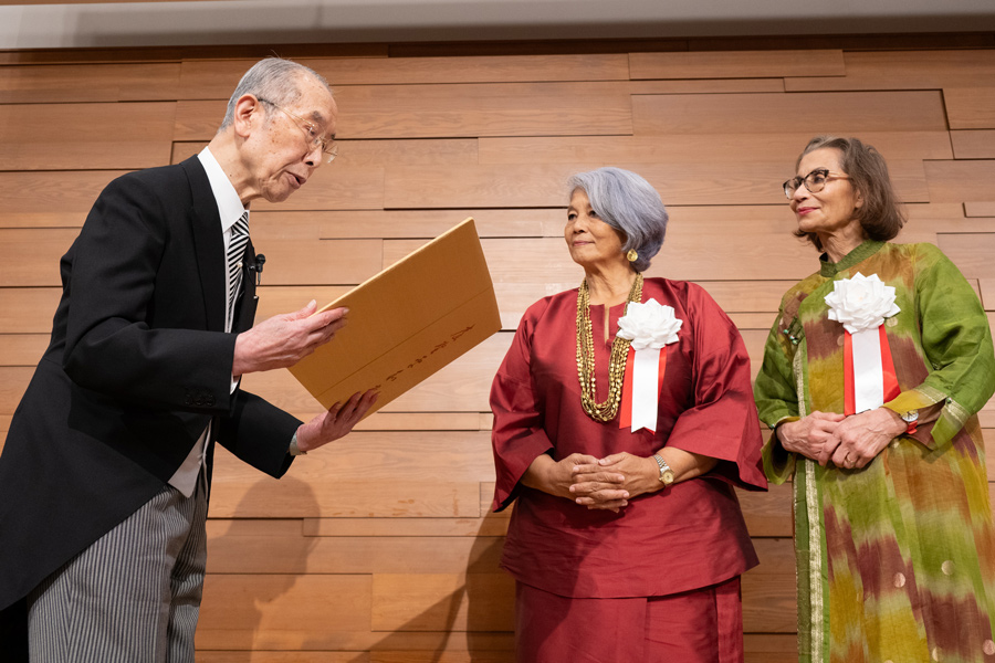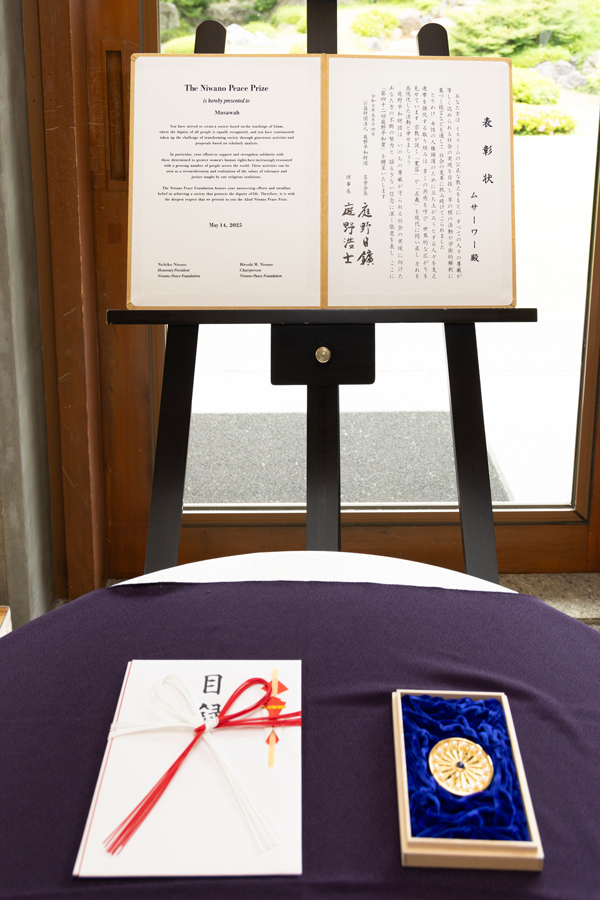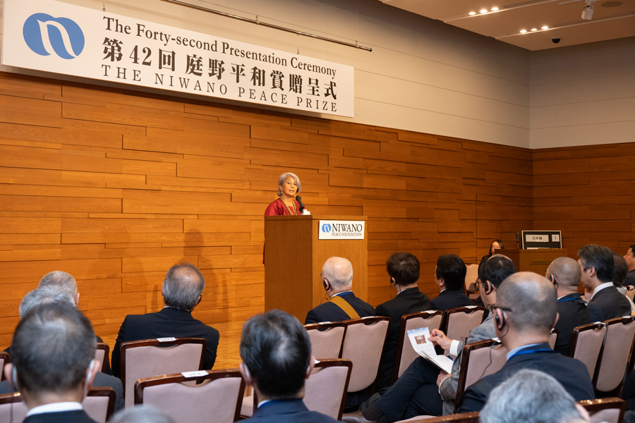 第42回庭野平和賞をムサーワーに贈呈いたしました。ムサーワーは、2009年にマレーシアで創立されました。ムサーワーとは、アラビア語で『平等』を意味します。主にイスラーム社会におけるジェンダー問題に取り組み、ムスリム家族法の改革や女性の人権保護を促進するため、地域および国際レベルで提言活動を行っています。また、地域での教育や女性のリーダーシップ促進、エンパワメントを目指し、40カ国以上に及ぶパートナー団体との協働を通じて多岐にわたる活動を展開しています。 こちらからダイジェスト版の贈呈式動画をご覧ください。 当サイトの内容の無断転載及び複製等の行為はご遠慮ください。