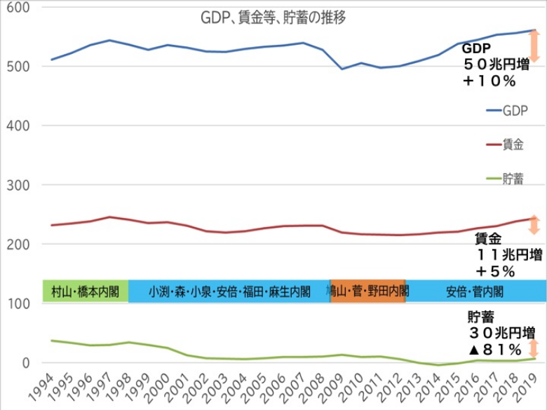 新型コロナウイルス感染症(COVID-19)のパンデミックによる影響、そして、その影響を最も深刻に受けられた方々の支援を考える上では、この事態が起きる直前、2019年までの経過を再確認する必要があります。 生産年齢人口は、1994年から2019年までの25年間で約1200万人(14%)も減少しました。一方で、一時は1倍を切っていた有効求人倍率は2.5倍ほどまで上がり、人手不足感が募っています。なのに、最低賃金は300円しか上昇しておらず、先進国では最低のままです。 GDPは、特にリーマン・ショック後に約50兆円(10%)増加しましたが、賃金の上昇は11兆円(5%)に留まっています。残りの約40兆円は、どこにいってしまったのでしょうか。2回の消費増税、物価の上昇があり、結果として減ったのは貯蓄です。雇用者が出す給与が少なすぎるのです。90年代後半に75%ほどだった労働分配率は、2019年は史上最悪レベルの低さでした。このことが格差を増幅しています。