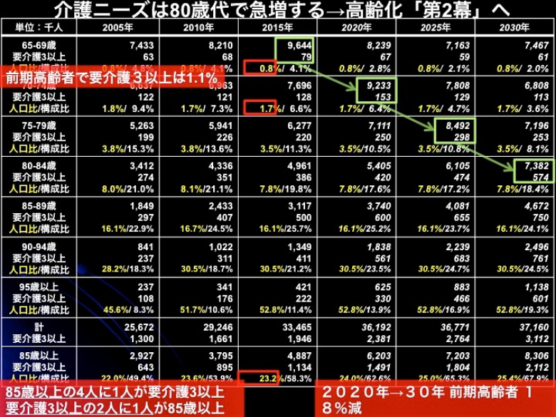 それでは、これまでとこれからはどのように違うでしょうか。大きな前提として考えなければならないのは、高齢化が「第ニ幕」に入ったという点です。これまでの高齢化(第一幕)では、65歳以上のすべての年齢層が増えていました。しかし団塊の世代が歳を重ね、2015年を境に、減少する年齢層が現れます。65〜74歳の前期高齢者が減っていくのです。前期高齢者は、町内会長や民生委員などを担う、いわばまちづくりの主役です。一方で、4人に1人が要介護3以上である85歳以上はこれからも増え続けます。また、若い世代の賃金が抑えられている今の状況では、政府自身がすでに認めているように、「若い世代が高齢者を支える」という社会保障制度の前提が崩れてしまっています。