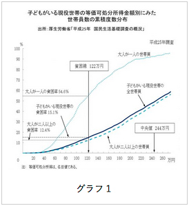 厚生労働省の「平成25年国民生活基礎調査の概況」によると、国民の約6人に1人、さらに、ひとり親世帯では半数以上が「相対的貧困」状態にあります(=グラフ1)。1980年代には、65歳以上の貧困率の高さが目立ちました。当時、貧困問題の中心は、高齢者だったのです。ところが2012年以降、若者や子どもの貧困率が急上昇しています。