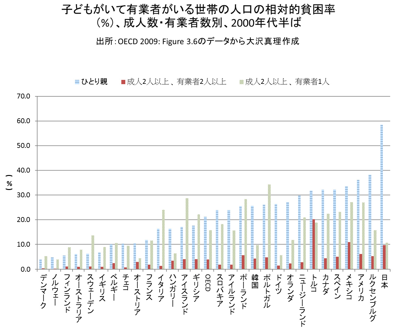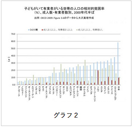 子どもの貧困について、「ひとり親」「成人2人以上、有業者2人以上」「成人2人以上、有業者1人」の3種の世帯に分けて調査した結果があります(「子どもがいて有業者がいる世帯の人口の相対的貧困率」=グラフ2)。「成人2人以上、有業者2人以上」の世帯とは、主に共働き家庭を、「成人2人以上、有業者1人」は、お父さんだけが働いているような専業主婦世帯を想像できます。調査結果から、経済協力開発機構(OECD)加盟国の中で、日本のひとり親世帯の貧困率の高さが、他国の追随を許さないほど突出していることが分かります。