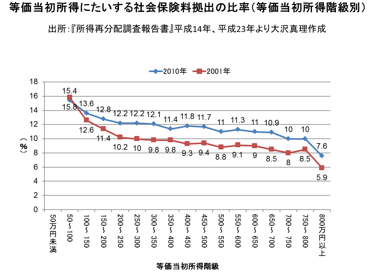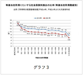 なぜ、「マイナスの効果」が強まるのでしょうか。理由の一つに、所得に占める社会保険料負担の割合が、日本では所得が低ければ低いほど重くなるという性質が挙げられます(=グラフ3)。オーストラリア、イギリス、アメリカなどの国々では、子どもが2人以上いる「ひとり親」には、税金や社会保障費負担が免除されるだけでなく、児童手当のような現金給付などがあり、手厚く保障されています。ところが、日本では、健康保険や介護保険、年金などの社会保険料については、所得に応じて一定額を支払わなければならず、所得が低いほど、社会保険料の負担割合が高くなる設計になっているのです。そうした意味で、「日本の低所得者は社会保険料負担の重圧にあえいでいる」と言えます。