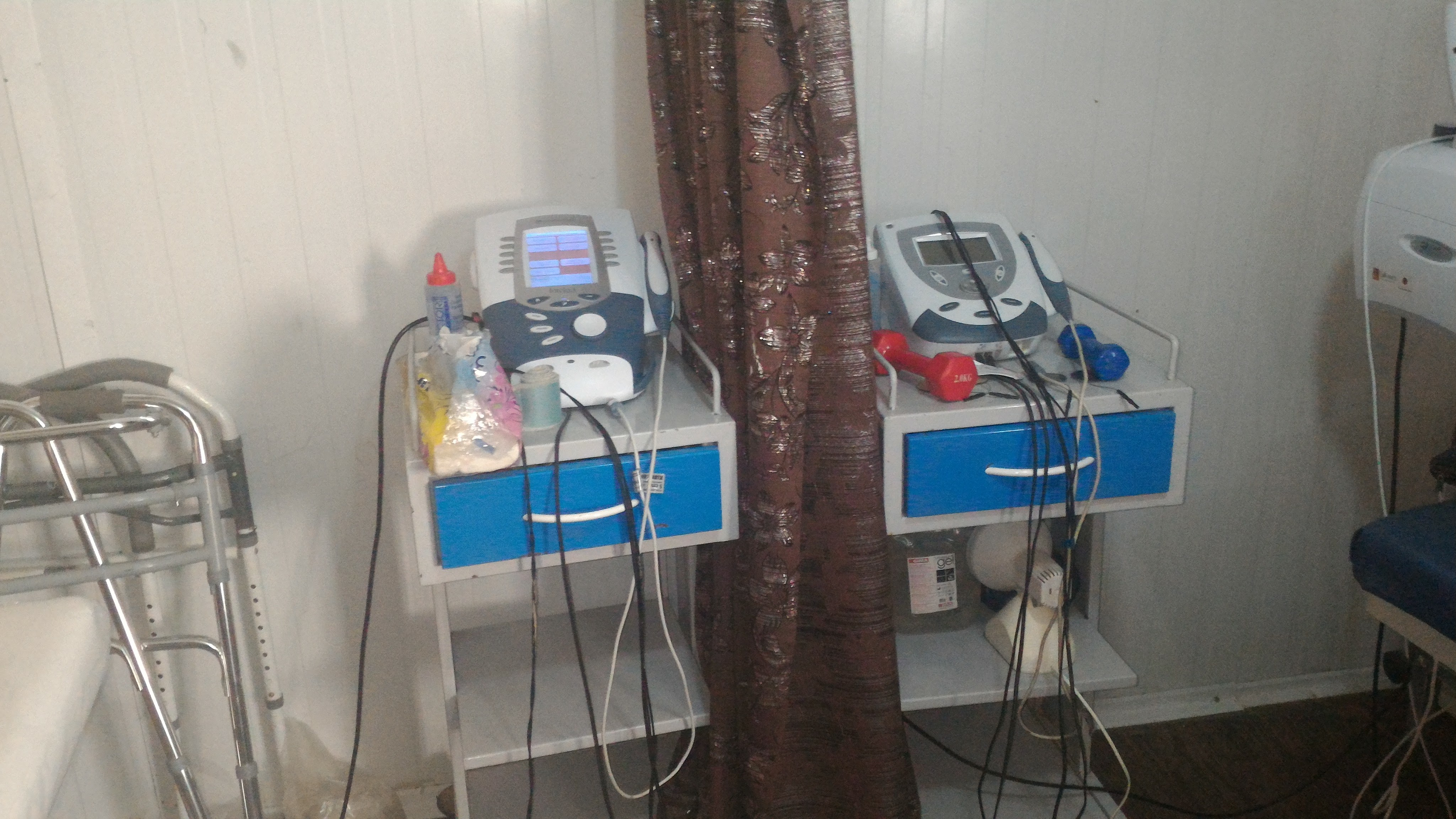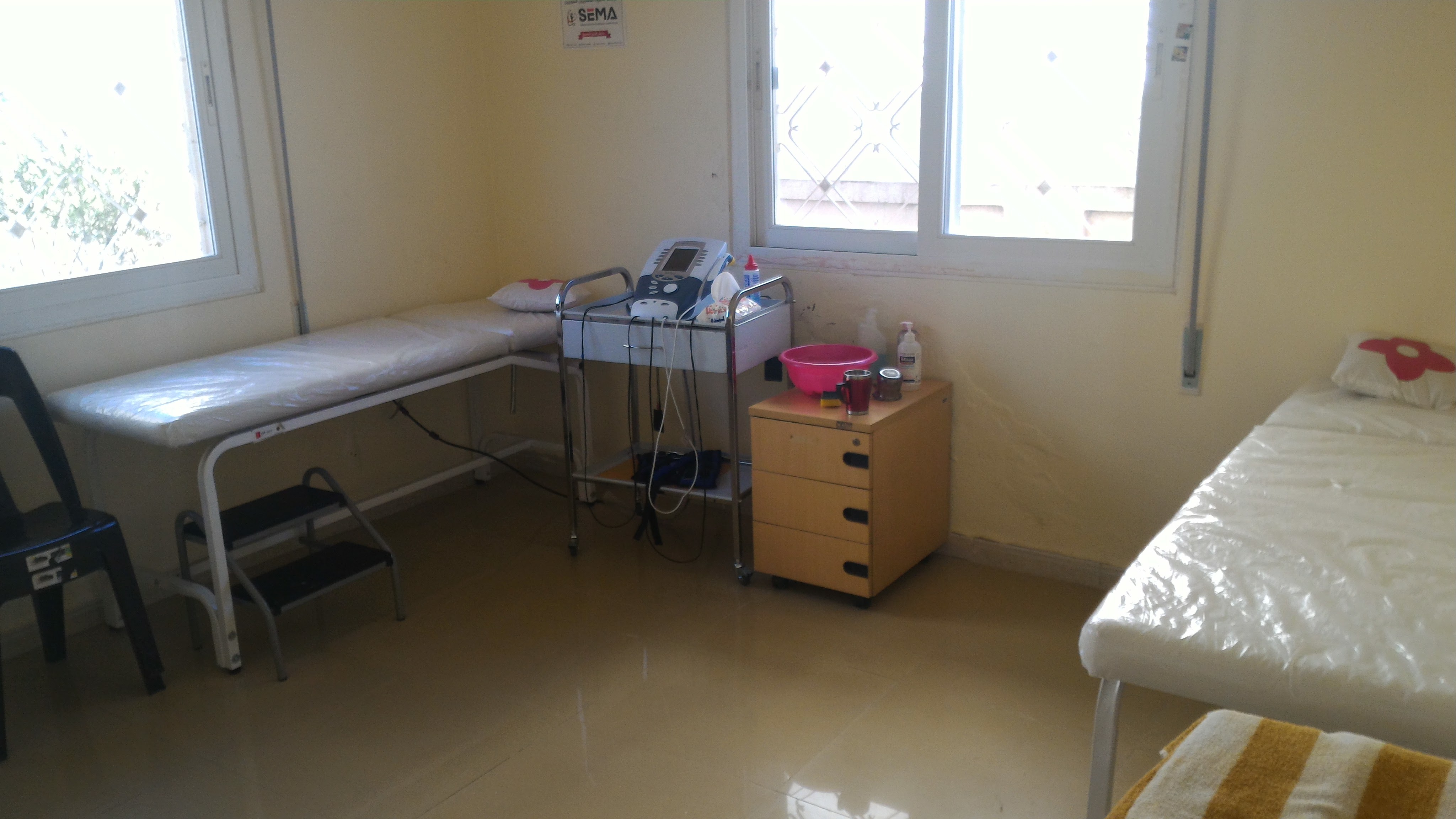 目的地であるキャンプ内のリハビリ診療所へ。キャンプ内の一角に内科や小児科等医療施設が集まった場所にあった。到着が遅くなってしまったが、2人の理学療法士が応対してくれた。 JIM-NETからAMRへの事業引き渡しに伴い、医療用ベッドやその他機器を細かく確認することが訪問の目的の一つであり、すばやくそれらの目的は達成された。