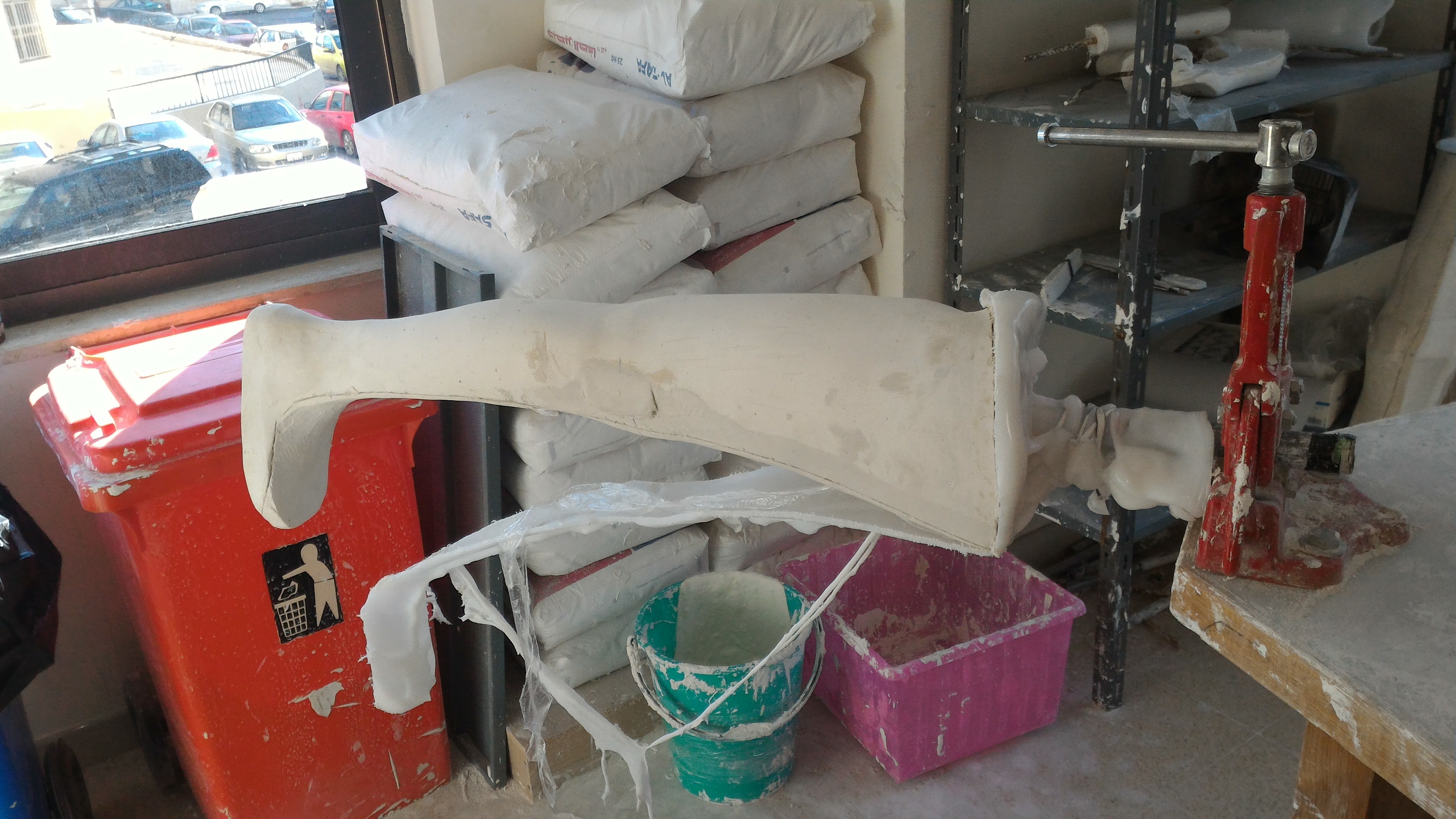 型に石膏を入れて固めた義足。使用者とのフィッティングは何度も行われる。