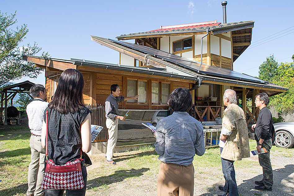一行は8日、NPO法人「いいだ自然エネルギーネット山法師」の運営する化石燃料ゼロハウス「風の学舎(まなびや)」を見学。風の学舎は、地元産の木材と伝統工法を生かして建設され、太陽光発電や太陽熱温水器、雨水タンクを備えた自給施設で、多くの市民や学校が研修などで利用している。