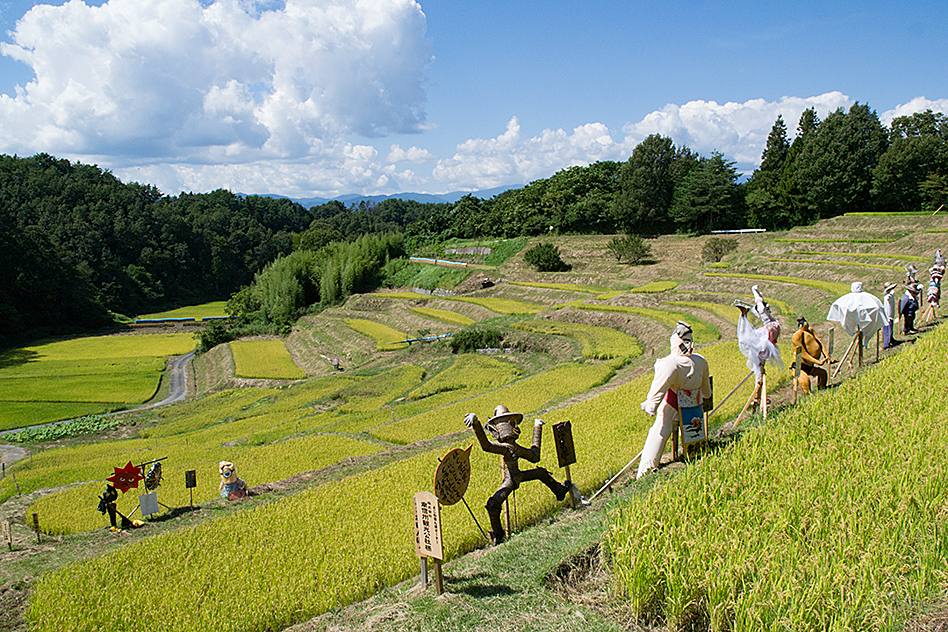 「日本の棚田百選」に選ばれた飯田市千代の「よこね田んぼ」。市内には穏やかな田園風景が広がる