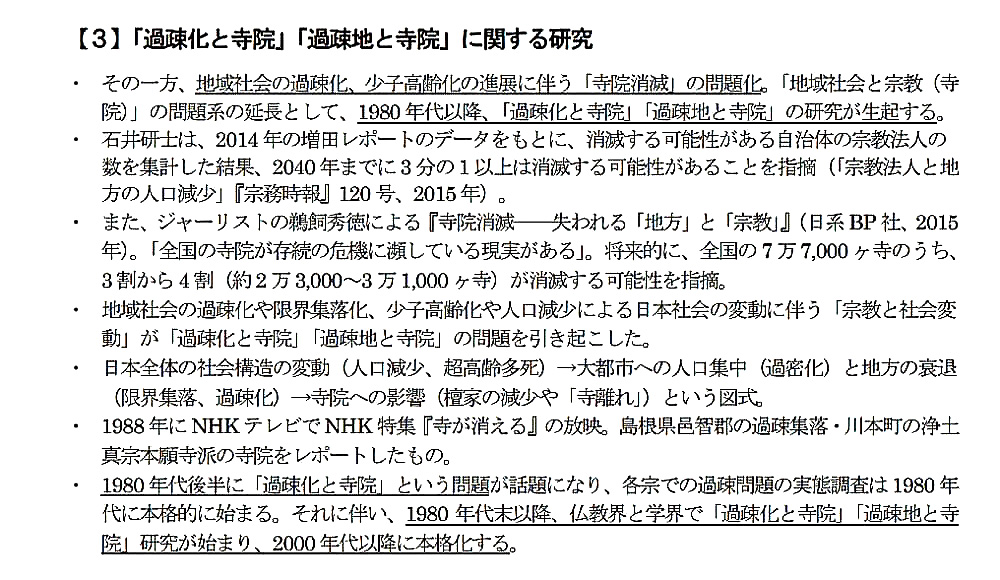 この問題については、特に日蓮宗が率先して日蓮宗寺院の過疎問題の実態調査を1980 年代に始めます。そういった動向を踏まえて、1980 年代末以降、仏教界と学界で、「過疎化と寺院」や「過疎地と寺院」、あるいは「過疎地域と寺院」などと言い方はいろいろありますが、研究が始まりました。2000 年代以降にそれが本格化するということが、今回、いろいろと論文を調べてみて分かりました。
