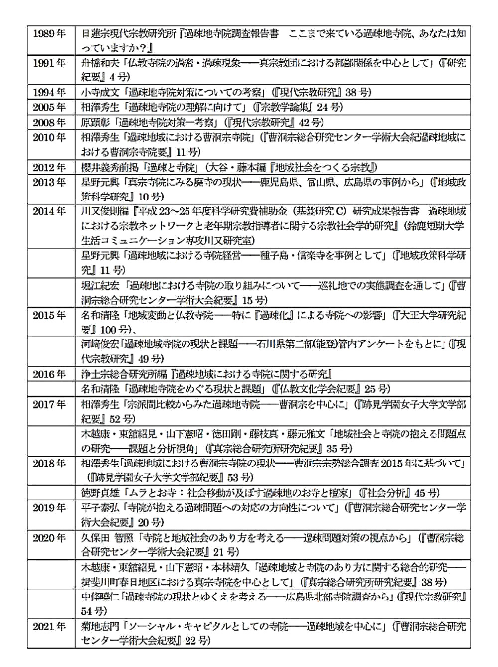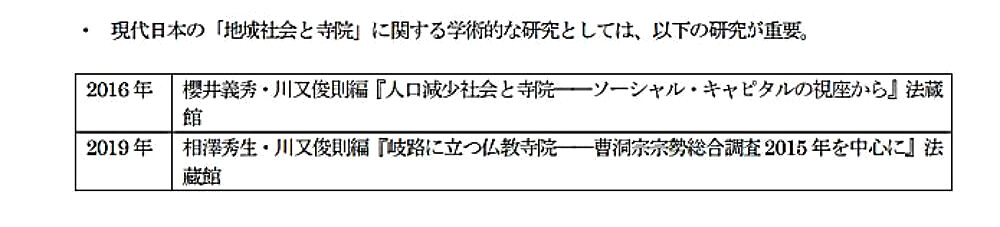 1989 年の日蓮宗現代宗教研究所(現宗研)の、『過疎地寺院調査報告書』が、この問題に関する宗派としての取り組みとしての嚆矢になりますが、これ以降、各宗派で調査、研究がされています。
