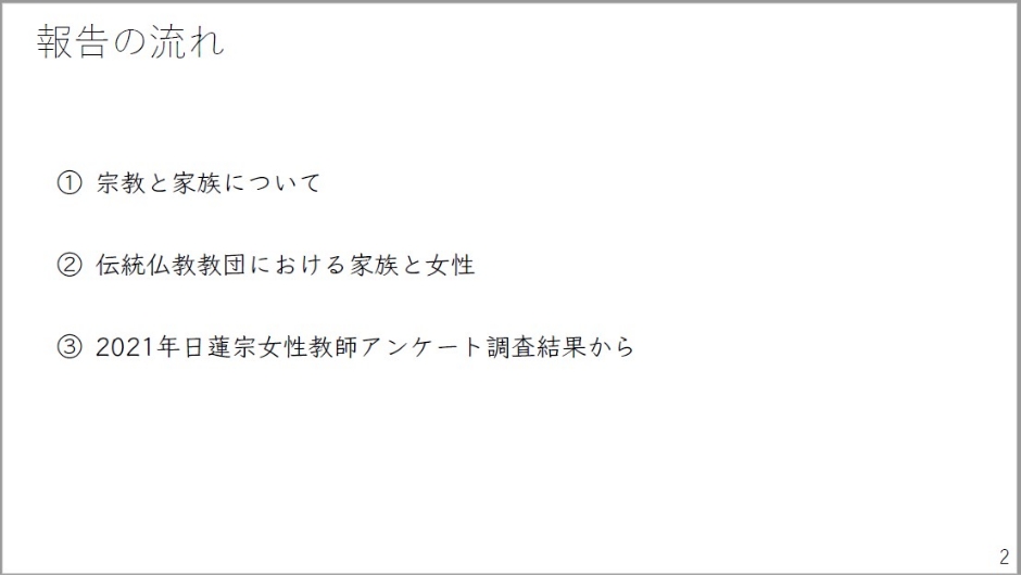 はい、よろしくお願いいたします。それでは私の方から30分ということでお話をさせていただきたいと思います。今回私は、日蓮宗において2021年に女性教師アンケート調査というものを行いまして、一部それを紹介するような形で、そこから見えてくる女性教師像の変化というものに、家族という問題がどう関わっているのか、家族というもの、作用するものについてお話をさせていただきたいと思います。