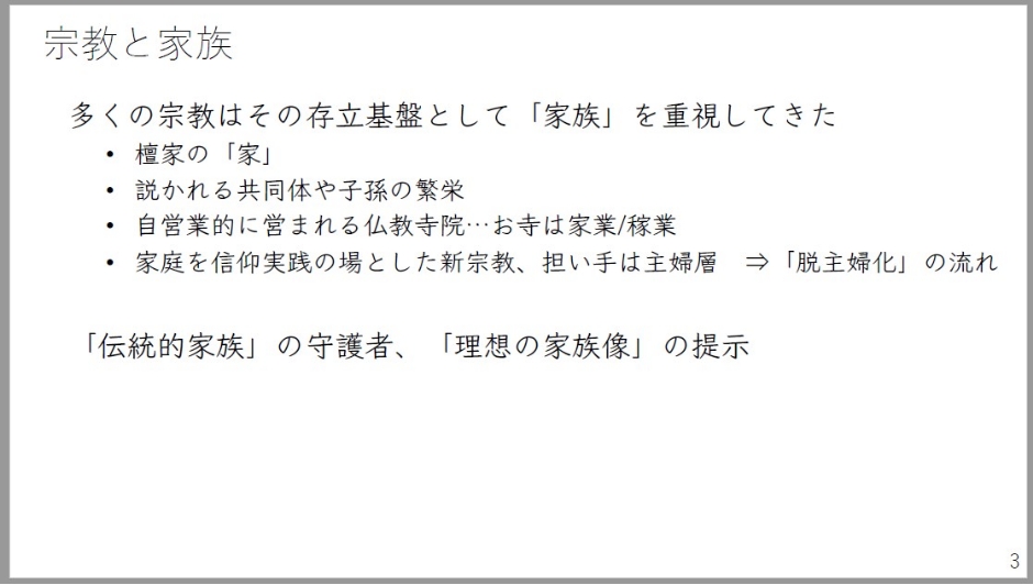 宗教と家族というものを考えてみれば、一部には家族というものに背を向ける教団というのはありますが、多くの宗教はその存立基盤として家族というものをとても重要視してきました。これは間違いのない事実かと思います。まず多くの日本人にとって宗教的なものと接するのはお葬式であったり法事であったりするわけですけども、ここで出てくる檀家とお寺の関係が重要です。檀家の「家」の字が象徴するように、個々の人びとは個人としてお寺と関係を結ぶというよりも、家族・家というユニットを基に仏教寺院と関わっていくという伝統が江戸時代から日本社会にはございます。さらに多くの教団では、説法であったり教えであったり、その中で共同体や子孫の繁栄というものが多く説かれます。そして特に、近現代の仏教寺院は実質上、自営業的に営まれています。お寺というものは、いわば、これは少し、ちょっと強い言い方にはなりますけども、家業であって、さらにこの稼ぐ稼業でもあるという実態があります。新宗教などを見てみれば家庭を信仰実践の場としてきたというものもあります。担い手は主婦層であるということが長らく言われてきましたが、近年、脱主婦化という現象が進む中で、それ自体が揺らいでいるというのが今日的な状況であろうかとも思います。また、宗教というものは多くの場合、伝統的な家族、良き家族というものを、その守護者であろうとしたり、理想の家族像というものを提示したりするというような側面もありました。