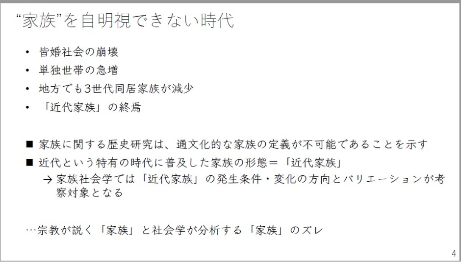 ただ私たちはもはや家族というものを自明視できない時代に生きています。皆婚社会、皆が適齢期に結婚するというようなもの、これはもう完全に崩壊しているような状況でもあります。さらに近年では最も多い世帯というのが、先ほどの石井先生のお話にもあったかと思いますが、単独世帯ですね。一人暮らし世帯が急増していて、恐らくこれはこれからも変わらないであろうと。そして、いわゆる三世代同居家族というもの。確かに各種の統計的な資料というものを見ていれば、比率として減少してはいましたが、実数としては実は20世紀末まではそんなに変わってなかったんですね。ただこれが21世紀に入って、地方における長男が同居しているような家族、これも減少傾向にある、というものがあります。これまでいろいろと言われてきましたが、家族社会学で言うところの近代家族というものが終焉を迎え、これから家族というものがどういう形態として進んでいくのか、というものが分析されていくような状況になろうかと思います。近代家族として想定される家族の在り方としては、教科書的な説明になりますが、まず、形として核家族であること。家族の中で情緒的な絆が強まっていること。夫婦が性別や役割分業を担うということ。日本においては、特に戦後の高度経済成長期における特徴的な家族の形として大衆化しました。父親がサラリーマンで、お母さんが専業主婦で家事・育児を主に担う。子どもは二人ほどがいて、その教育などはお母さんがその責任を負うというものですね。ただ、これというものが、近代という特殊な時代に普及した、あくまで歴史的な形態であるというふうに家族社会学では考えます。ですのでこの発生条件、変化の方向とバリエーションが考察の対象となってきたわけです。私自身の研究的な問題関心としては、宗教が理想的に説く家族というものと、社会学が分析する家族のズレというものがあります。ここのズレが、私の最近の研究課題として考えているところでもあります。