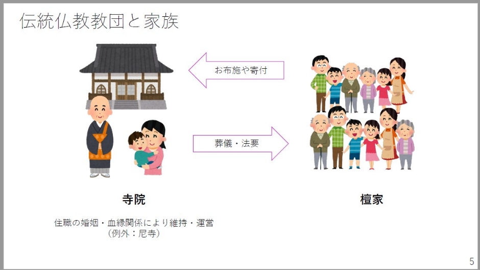 続いて「伝統仏教教団と家族」ですけども。伝統仏教教団というものは、今回この研究会に参加されている方は皆さんご存知かと思いますけれども、家族というものがいろいろな意味でとても重要な役割を果たしてもいます。多くの寺院は、住職、特に男性ですね、男性住職の婚姻・血縁関係により維持・運営されています。その例外としてあったのが、いわゆる尼寺です。尼寺の多くは、最近はまた変わってはきていますが、養女を迎えてつながれてきました。また檀家の側も、家族単位で寺院と関わり、お布施や寄付をすることでお寺を支える。お寺の側は、一家の葬儀・法要というものをすることでフィードバックするというようなフォーマットがあったわけです。住職、多くの場合、男性がやはりどの統計を見ても多くあります。もちろん娘さんが継ぐケースというのもありましたが、最近はこれからお話していくように少しづつ変わってきてはいます。特に娘さんがお寺を継ぎたいと言った場合、寺の格が落ちるので檀家から拒否された、何ていうお話が私も何度か聞いたことがあります。しかし、現在のお寺の問題というものを大きく見ていくと、寺の格が落ちる以前の問題として、お寺の存続自体が危うい。そしてお寺を支えている檀家さんたちが存在しにくくなってきている。特に都市への人口流動であったり、家族、お寺のお墓の継承というが弱くなってきている。お寺を継ぐ後継者が少なくなってきている。どちらもこれは家族の問題と密接に関わっているわけです。