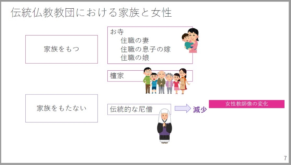 さて伝統仏教教団における家族と宗教というものを考えたときに、かつては家族を持つ女性と家族を持たない女性と大きく分けることができたかと思います。ピンク側の枠である方が聖職者ではない側ですね。で、紫色の方が聖職者になります。家族を持つ女性としてはお寺の住職の妻だったり、住職の息子のお嫁さんであったり、住職の娘さんたちがいらっしゃいます。檀家さんたちもいますね。檀家の女性は、法事のスケジューリングをお寺とやり取りをしたり、日常的にお寺と関わったり、家族行事としての祖先祭祀的なもののコーディネーター的な役割を多く果たしてらっしゃる方が多くいらっしゃいます。それに対して、伝統的な非婚の尼僧さんたち尼寺に住まわれてやってらっしゃったという方も多くいらっしゃいました。ただこのような尼僧さんたちは減少傾向にあります。そして今回のアンケート調査でも数値の上でも出てきましたが、住職の娘さんたちが女性教師になる傾向というものが、特に日蓮宗においては少なくとも確認することができます。