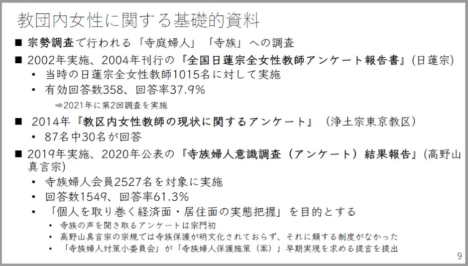 さて、いわゆる尼僧さんたちとはまた異なりますけども「教団内女性に関する基礎的な資料」というものがいくつかございます。まず各宗派の宗勢調査で行われる「寺庭婦人」「寺族」への調査というものですね。この他にも2002年、2004年刊行の『全国日蓮宗全女性教師アンケート報告書』というものがあります。これは初めて全国規模で女性教師の実態というものに迫った調査という形で出されたものです。今回、時間を割いてご説明するのがこの第二回調査ということになります。この他にも例えば浄土宗東京教区では2014年に『教区内女性教師の現状に関するアンケート』というものを行っていますし、高野山真言宗でも、寺族婦人、ご住職の妻ですね、妻の意識調査アンケート結果報告というものがなされています。注目していただきたいのは回答率が61.3%と非常に高い回答率を誇っているんですね。これは恐らく寺族婦人の方々が自分たちの声を届けたいということでたくさんの回答がなされたということかと思います。この内容自体は例えば『月刊住職』などでも報じられてもいますけども。