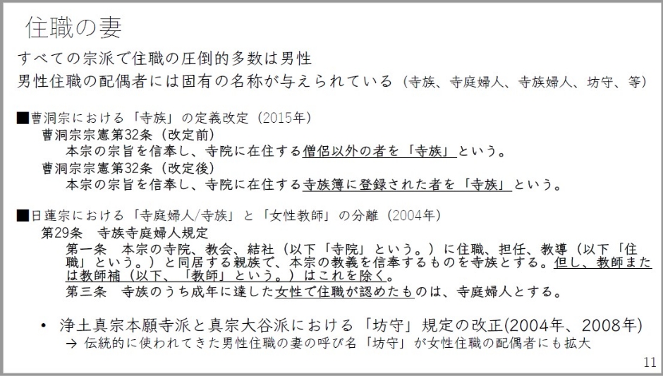 さて住職の妻は宗門の、特にお寺の運営についてとても重要な役割を果たしており、特定の役割も期待されています。すべての宗派で住職の圧倒的多数は男性であります。男性住職の配偶者には宗派によりますが固有の名称が与えられています。曹洞宗においては寺族の定義というものが2015年に変わっています。それまでの「寺院に在住する僧侶以外のものを『寺族』という」が改定されて「寺族簿に登録された者を『寺族』という」となりました。家族だとか婚姻関係に関する文言というものは定義の中には含まれていません。日蓮宗においては親族という言葉がここに見られるように、婚姻関係というものを前提にしたものがあります。これも2004年で変わっていますけども、寺族寺庭婦人規定として「本宗の寺院、教会、結社に住職、担任、教導と同居する親族で、本宗の教義を信奉するものを寺族とする。但し、教師または教師補」教師資格を持っている方ですね「はこれを除く」というようになっています。「寺族のうち成年に達した女性で住職が認めたものは、寺庭婦人とする」という形になります。日蓮宗は、男性住職の妻でありながら同時に教師資格を取っていた人たちもいたんですね。ここが一つ日蓮宗の独自なポイントになります。この宗制改定により、寺族・寺庭婦人と教師、女性教師を分離したことによって、ここで「除く」という法令的な表現としてとても強い言葉が使われています。この「除く」という言葉に対して、強い排除というニュアンスを持たれた女性教師の方いらっしゃったようで、これに対するご意見というものもアンケートの中にも寄せられてもいました。もう一つ見ていきますと、浄土真宗本願寺派と真宗大谷派においては坊守(ぼうもり)というものの呼称の規定が改正されています。「伝統的に使われていた男性住職の妻の呼び名『坊守』が女性住職の配偶者にも拡大」されたというとても大きな出来事がありました。