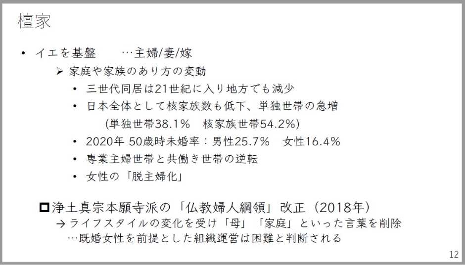 檀家については先ほど申し上げたとおりですね。イエというものを基盤にしてありますが、今日では家庭や家族の在り方というものが大きな変動期にあります。専業主婦、共働き世帯の逆転はもう90年代以降どんどん広がっていますし、主婦として生きる以外の女性の生き方というものが広く社会の中で許容されているような状況になります。このような状況の中で浄土真宗本願寺派では2018年に「仏教婦人綱領」というものが改正されて、ライフスタイルの変化を受け「母」とか「家庭」といった言葉が削除されています。既婚女性を前提とした組織運営は困難と判断されていたということでもあります。
