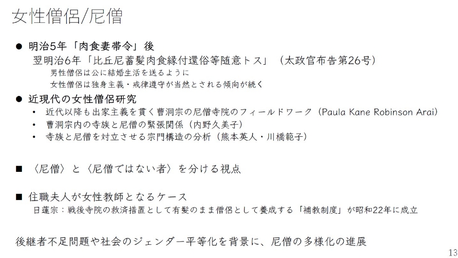 そして女性僧侶、尼僧については、明治5年の「肉食妻帯令」の翌年、あまり言及されることはないんですけども、「蓄髪肉食縁付還俗等随意トス」とする太政官布告が出ています。さらに男性僧侶は公に結婚生活を送るようになってきた一方、女性僧侶はずっと独身主義・戒律順守が当然とされる傾向が続いてきました。女性僧侶研究はこのフォーマットを踏襲していたものが続いてきました。また、尼僧と尼僧ではないものを分ける視点というものも、2000年代以降もいろいろなところで見られます。例えば有名な所では、鵜飼先生の『寺院消滅』でも尼僧と女性僧侶という言葉を分けて書かれています。当の女性僧侶たちの間でも、尼僧さんと自分たちという形で分ける視点というのもあります。日蓮宗の場合は先ほども言いましたように住職の妻が女性教師となるケースというものがあります。後継者不足問題や社会のジェンダー平等化というものを背景にして尼僧の多様化というものが進展しているというような状況があります。