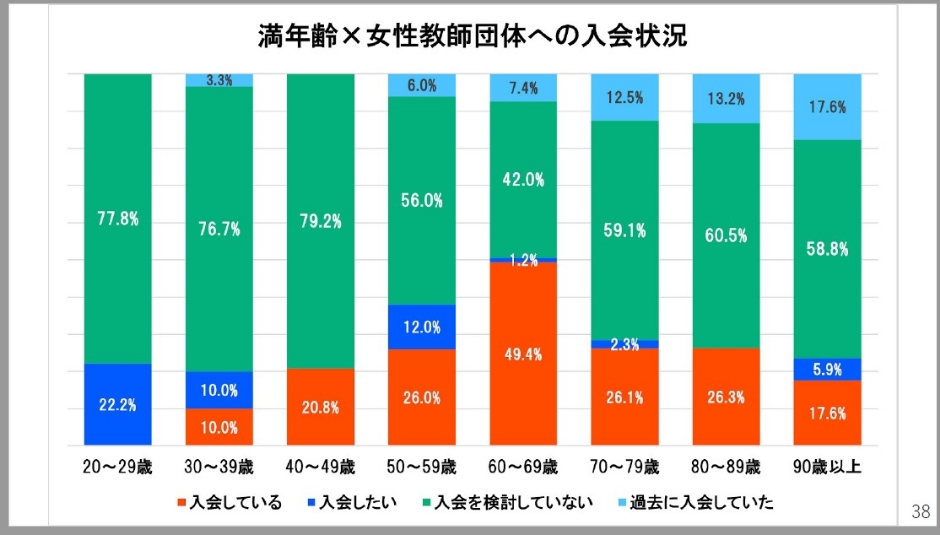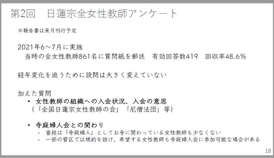 さて、少しちょっと時間を飛ばしますけども、第2回となる女性教師アンケート報告書はもうすぐ刊行される予定です。日蓮宗においては、途中少し飛ばしてしまったんですけども、高度な宗教的職能者としての尼僧さんと、僧侶の妻を有髪のまま養成するというような制度が戦後から長く続いてきたこともありました。そのために女性教師の様々な姿があったわけです。そして2021年、19年ぶりにアンケート調査を行いました。回収率48.6%、非常に高い数値を得ています。加えた質問としては、女性教師の組織への入会状況、寺庭婦人会との関わりです。