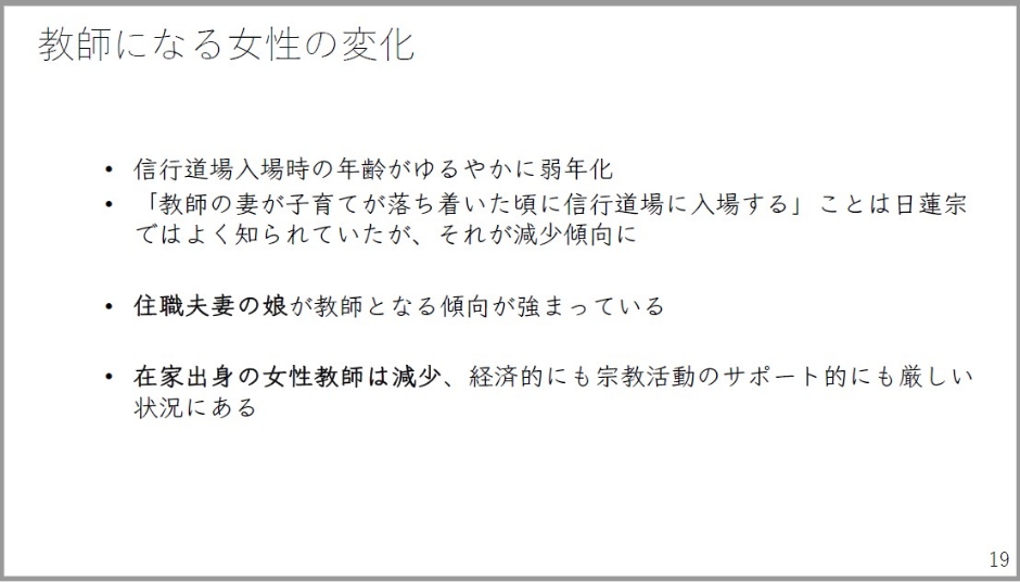 ここで教師になる女性の変化というものが明らかに見て取れました。信行道場に入場する年齢が緩やかに若年齢化しています。住職の妻が子育ての落ち着いた頃に信行道場に入場する、中高年の在家出身女性が発心するということが日蓮宗ではよく知られていたんですけども、これが恐らく減少傾向にある。その代わりに増えてきているのが、住職夫妻の娘が教師となる傾向です。在家出身の女性教師は減少していて、経済的にも宗教活動のサポートが得られにくいというものがあります。