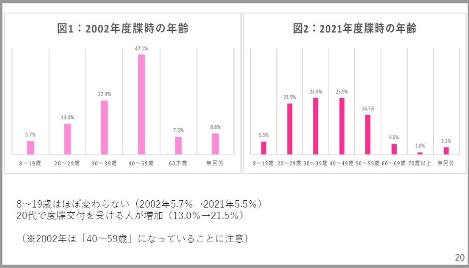 度牒交付時の年齢を見ると、8歳から19歳はさほど変わらないんですけども、20歳代で度牒交付を受けている人たちが増えています。2002年の方は40から59歳がひとまとめになっているのでグラフが見えにくいんですけども、2021年の方は足すと40.6かと思います。度牒交付時に20歳代の人が2割に達しているということは変化として言えるかと思います。
