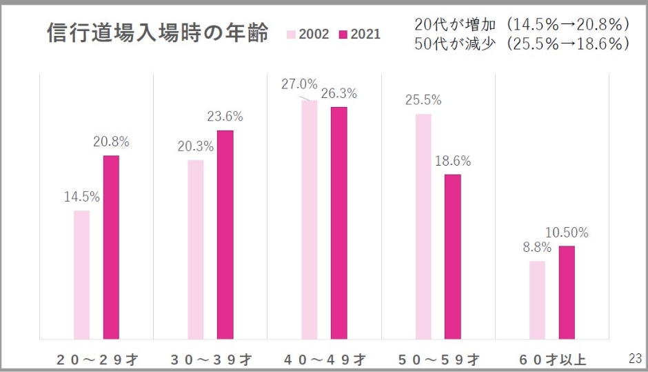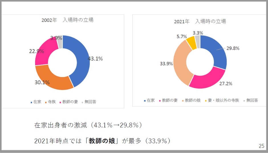 入場時の立場を見てみます。2002年の調査では在家出身の人が4割を超えていましたが、2021年調査では3割を下回っています。今回調査で多くなっているのが、教師の娘なんです。ここは設問の選択肢が少し異なっていますので、簡単に比較はできないんですけども、教師の娘たちが3割を超えて、2021年の時点では最多になっています。