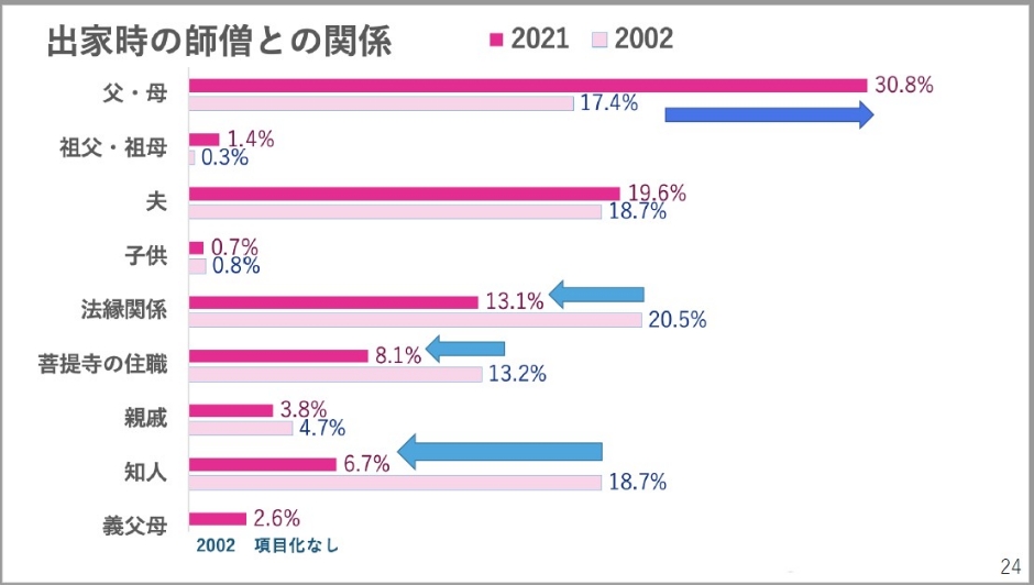 信行道場入場時の年齢も見てみると、20代での信行道場に入場が2割に達しています。その代わりに減っているのが50代です。これも先ほど言ったように、教師の妻が子育てが落ち着いた頃に信行道場に入るというような女性教師、そういうモデル的なコースがあったんですけども、これがやや減ってきていて、むしろ20代が増えてきている。じゃあこの20代で増えてきている人たちは誰なのかというもので、参考に成り得るのがここです。出家時の師僧との関係を見てみると、大きな変化がありました。父・母が師僧であるという人たちが17.4%から30.8%まで増加しています。その代わり減少しているのがこちらです。おそらく在家出身の人だと思われる、法縁関係、菩提寺の住職、知人というものが減少しています。他はそれほど変わっていませんが、2021年時点で、3割の女性教師が父・母が師僧であるというような状況があります。