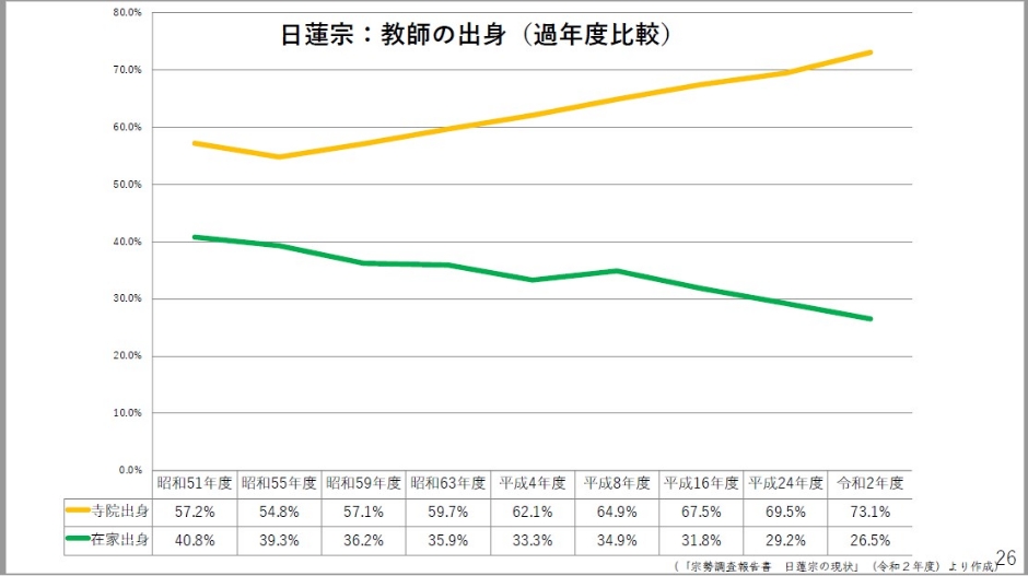 ただこれは女性教師に限りません。日蓮宗全体で教師の出身を過年度比較してみると、黄色がお寺の出身の方、緑が在家出身の方で、どんどん在家出身の方が減ってきている。女性教師の場合もそれと同じような傾向を示しているわけですけども、かなりの変化として見ることができるかと思います。