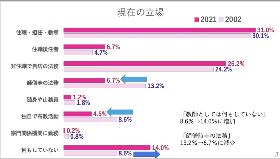 現在の立場も確認してみたいと思います。住職・担任・教導、つまり代表役員ですね。これはほとんど変わっていません。住職後任については微増と言っていい程度に留まっているかと思います。減少の方に着目してみると、師僧寺の法務、独自で布教活動というものが減っています。これは恐らく在家出身の方々です。さらに何もしていないというものが増えているというところも気になります。少しここで確認してみると、やはり師僧寺の法務が減っている。在家出身の方々が減っているであろうことは間違いないことだと思います。