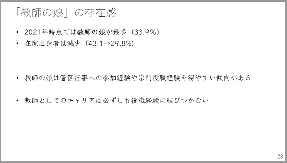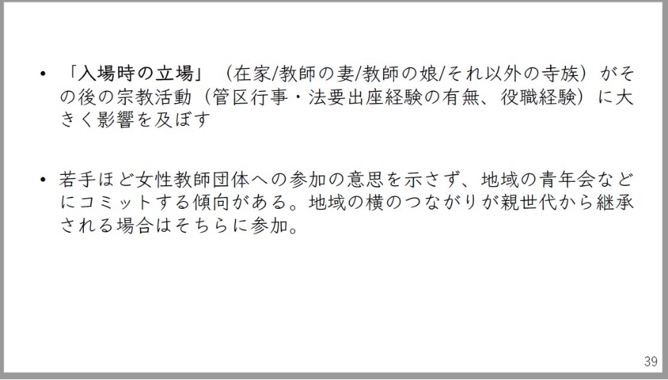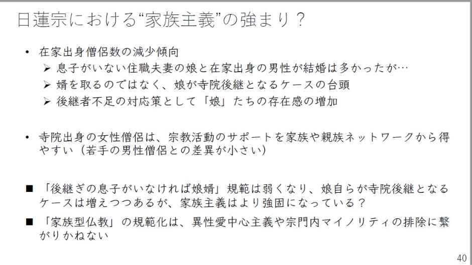 このように見てみると、確かに日蓮宗において女性教師達の存在感というものは強まってきていますが、深く考えてみる必要があろうかと思います。これは、私は家族主義の強まりである可能性があるからではないかと思っております。在家出身僧侶数の減少傾向。これは全体としてあるわけです。息子がいない住職夫妻の娘と、在家出身の男性が結婚するというケースが多かったわけですが、今日では娘自身が後継としてお寺にいることも認められるし、娘自身もそれを目指すというような形が出てきています。婿を取るのではなくて娘が寺院後継となるケースというのは無視できないほどには台頭している。後継者不足の対応策として娘たちの存在感というものが増加している。これ自体は恐らく間違いないかと思います。寺院出身の女性僧侶は、宗教活動のサポートを家族・親族ネットワークから得やすいため、若手の男性僧侶との差異が小さくなります。同時に「後継ぎがいなければ娘婿」という規範は弱くなってきている。そして娘自らが寺院後継となるケースが増えつつあるのであれば、これは家族・血縁主義、そしてよりそれが強くなっている可能性が指摘できるのではないかと思います。ただこの家族・血縁によって継承する寺院というものを規範化することは、これ異性愛中心主義ですしマイノリティの排除に繋がりかねない危険性というものもあります。家族を自明視できない時代であるということを発表の冒頭でも申し上げましたが、その中で仏教教団内では家族・血縁主義が強まっている可能性がある。恐らくこれはこれから進んでいくかもしれない。この方向性の意味は考えなくてはいけないという形で、ひとつ、アンケート報告書から報告させていただきました。