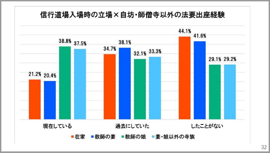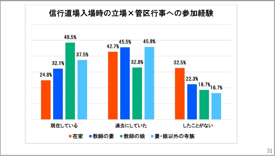 信行道場入場時の立場と管区行事への参加経験です。少しちょっと見にくくて恐縮なんですけども、教師の娘が緑色です。現在しているが48.5%と半数に近いんですね。教師の妻は日常的には寺庭婦人として過ごされている方が多いので少し低いのは分かるんですけども、在家出身の方、現在している方が四分の一まで落ち込んでいます。過去にしていた、したことがないを見るとかなり高い数値が出ています。立場による傾向の違いというもの、これは明らかです。教師の娘はこのような経験を積みやすいけれども、在家出身の方はその経験が積みにくい。χ2(カイ二乗)検定の残差分析もしていますがやはり1%水準で優位差も現れています。