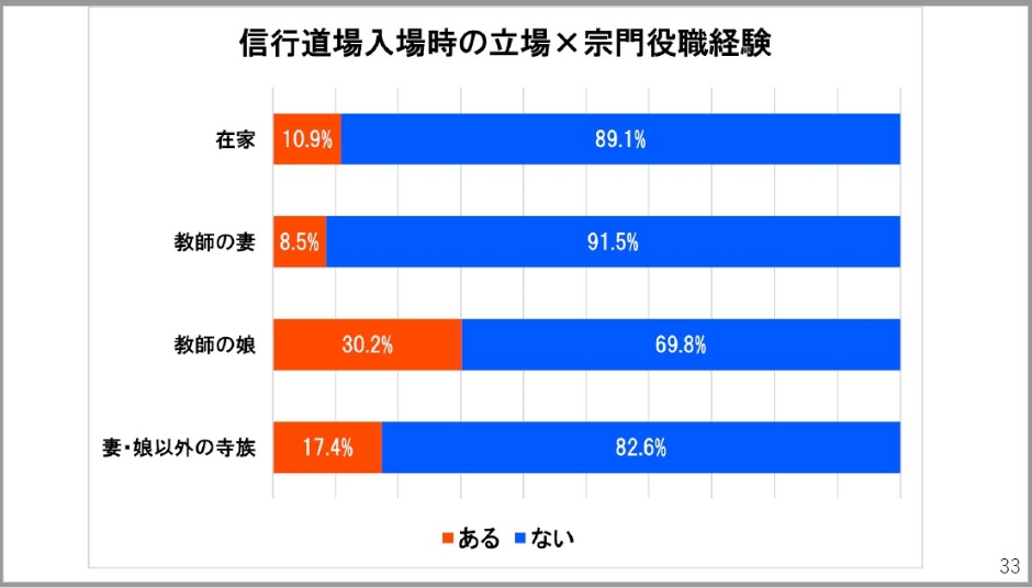 よりそれが現れていたのが、宗門で役職経験を得たことがありますかというものです。教師の娘、多くは若い方が多いんですけども、3割がしたことがあると答えています。それに対して在家出身の方は1割にとどまっているんですね。