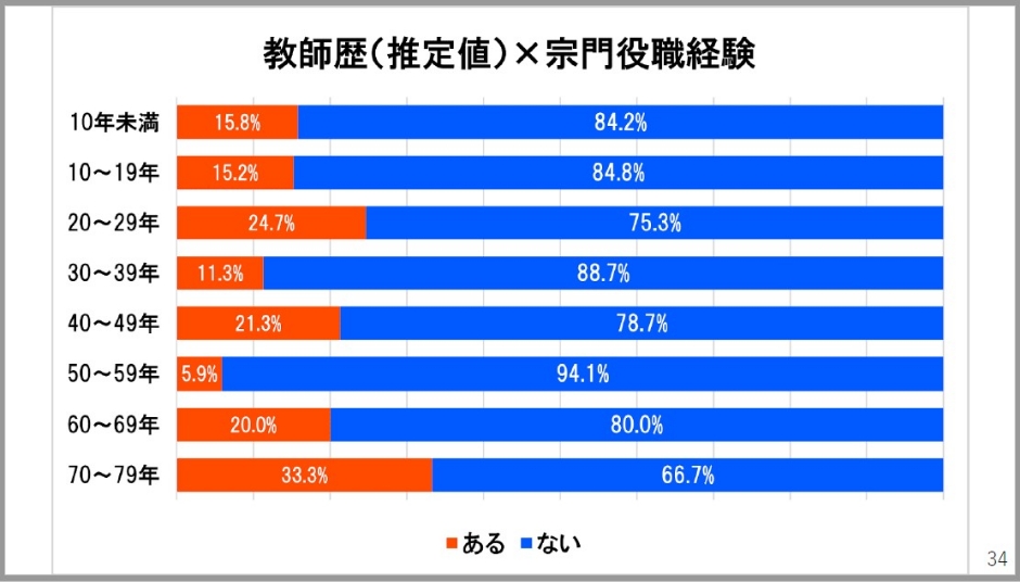 教師歴の方を見てみると、必ずしも長いキャリアが役職経験に結びついている訳ではないということも見えてきました。教師歴20年から29年の層は24.7%。経験も積んで年齢的にもいろいろやりやすい所かと思います。ここは確かにあるんですけども、その先になると高齢的な問題もあるのか伸び悩んでいますね。ここは少し考えていく必要があろうかと思います。