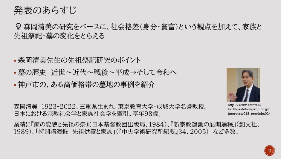 本日のあらすじはこちらのとおりでございます。森岡清美先生の研究をベースにしまして、それに社会格差、具体的には身分・貧富の差という観点を加えて、家族と先祖祭祀・墓の変化を歴史的に捉えていきたいと思っております。森岡清美先生の先祖祭祀研究について、初めにごく簡単ですがご紹介させていただきます。続いてお墓の歴史について、近世以降、近代、戦後、平成という展開を、日本全体として捉えていきます。さらに具体的な事例としまして、私が現在調査をさせていただいている神戸市の墓地の事例をご紹介します。森岡清美先生は昨年98歳で亡くなられましたが、庭野平和財団さんとも非常に関係の深かったかと存じます。日本における宗教社会学や家族社会学を牽引してこられた先生で、多方面で研究を残されていますけれども、先祖祭祀に関しても非常に大きな業績を残されています。