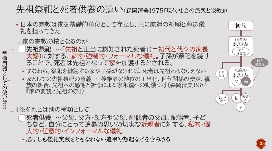 まずは森岡先生の研究にもとづきまして、学術的な概念としての先祖祭祀・死者供養について、ご説明をさせていただきます。もとより日本の宗教学では「家」の存在が非常に重視されてきました。これは日本の宗教がもともと家を基本的な単位として存在してきたためです。先ほどの石井先生のお話にもありましたように、もはや現在ではそうしたことを実感できないという世代の方がほとんどなのかもしれませんが、伝統的に日本の宗教はまずベースとして、家の繫栄を祈ったり、家が絶えたり衰退したりすることがないように祈願をすること、それから家のメンバーが亡くなったらその葬送儀礼を行うことを中心として営まれてきました。そうした意味で、家は宗教的な性質を持っていたと言えるわけです。その家の宗教の核となるのが先祖祭祀だったと言われております。学術的な捉え方としましては、先祖祭祀とは先祖と正当に認知された死者に対する、家的な、強制的な、そしてフォーマルな儀礼のことを指します。人が亡くなったら誰でも、先祖になれるわけではなくて、家を作った初代から系譜的につながる家長の代々の夫婦が亡くなった場合に、先祖となって祀られるとされています。こうした非常に規範的な概念においては、結婚せずに若くして亡くなってしまった方とか、それから子供を持たなかった方は、正当な先祖にはならないと観念されます。また、儀礼は家族の公式的な行事なので、私は参加しませんということは基本的には認められず、必ず参加するものとされたと。子孫が先祖を祀り続けることで初めて死者は先祖となり、そして、先祖が超自然的な力でその家を守ってくれると、家を繁栄させてくれると信じられてきた。すなわち子孫が代々祀ってくれなければ死者は先祖とは成りえないですので、家が絶え、子孫がいなくなれば、先祖祭祀が行われなくなって、死者は先祖とはなれない、いわば浮かばれない霊魂という形になってしまうというわけですね。加えて、先祖祭祀はそうした先祖の魂を供養するという宗教的な意味だけではなく、家という組織を維持するうえでの意義をも持っていました。後継者の存在を明らかに示す、正当化するという役割や、初代・二代目・三代目、自分は何代目にあたるという系譜性の認識を新たにして関係を安定化させる役割、それから儀礼の際に本家や分家が集まることによって、その家の一体感・連帯感を高める役割、また、年ごとに先祖へ家を繁栄させてほしいと祈願することによって、自分たちとしても「よし、みんなでがんばって家を繁栄させていこう」という動機づけをもたらす役割。このようにして、先祖祭祀は家の存続や繁栄にとっての大きな機能を持っていたわけです。以上のように家のフォーマルな儀礼としての先祖祭祀があるわけですが、それとは分けて考えるべき別の種類の概念として、死者供養というものがあります。これは自分の大切な故人に対する慰霊とか追悼の想いといったものです。たとえば「お世話になった、大好きだった、母方のおばあちゃん」は、先ほど言った従来の家的な枠組みから外れてしまうわけですね。通常、父方の祖父母は家の正式な意味での先祖になりますが、婿養子とかそういった事情でない限り、母方の家系は家ではないので、家のフォーマルな先祖祭祀儀礼は行われません。でも、自分の大好きだった母方のおばあちゃんについて、個人的に墓参りをしたり、高野山を訪れた際に塔婆供養を申し込んだり。あるいは必ずしもそういう宗教的な儀礼ではなくても、家に写真を飾っておいて心の中で思い返したり、少し手を合わせたりといったぐらいことも含めてもいいのかもしれません。こうしたことは、あくまでも個人的に大切な死者を想う個人的な死者供養であるとして、家のフォーマルな先祖祭祀とは、分析概念としては分けて考えられてきました。