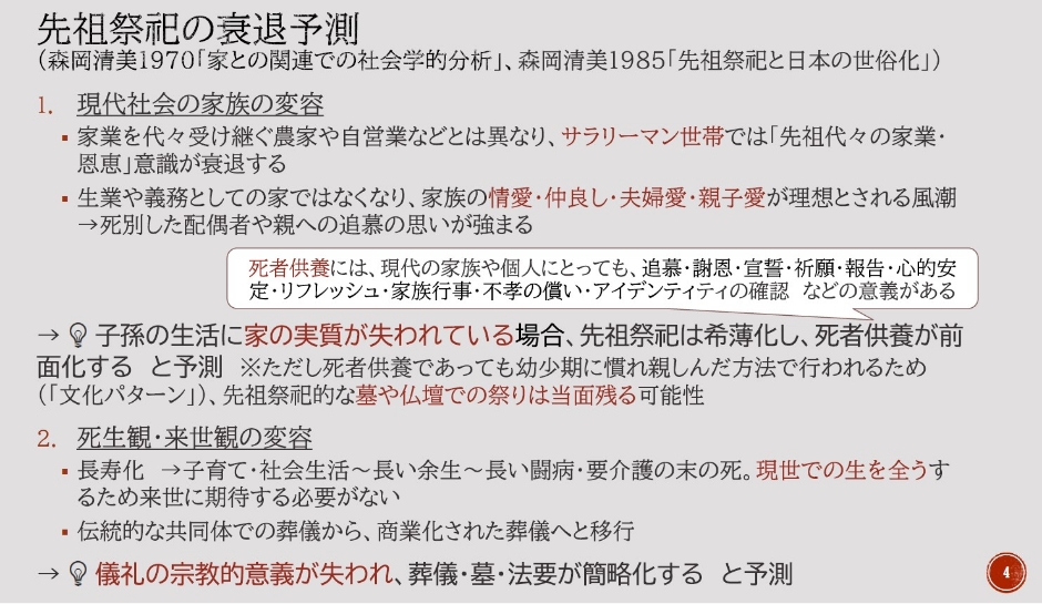 このような前提の上で、前者の方の先祖祭祀が現代社会においてどうなるかを、森岡先生は既に1970年頃から提示されていらっしゃいました。まず一つは、戦後の社会で家族が変化してきたことによって先祖祭祀は衰退するだろうということです。農業や漁業、いわゆる昔ながらの商家さんとは異なる、サラリーマン世帯が増えました。それは自分が外の会社で稼いだお金で家族を食べさせていくという形になりますので、先祖代々の家業を継いでいくとか、先祖の恩恵によって今の我々がある、生かされているといった感覚が衰退していくだろうと予想されます。また自分が、生まれて、生かされている家に所属し、家に奉仕するという感覚が弱まり、むしろ家族とは愛情で結ばれた夫婦がいて、子どもができたら大切に愛情たっぷり育てると。自分の後継ぎとしてではなく、自由な意思を持った存在として育ててると。愛情の場、安らぎの場といったことが家族の第一義的な目的になってきます。そのような情緒で結ばれた家族が亡くなると、フォーマルな儀礼を行うというよりはむしろ、大切な家族を追悼したい気持ちの方が前面に出てくるだろうということです。このように我々の生活の中から、いわゆる伝統的な家の実質が失われている現代では、森岡先生の予測によりますと、先祖祭祀は希薄化していき、そして死者供養が前面化するというわけです。ただし、そうした私的な死者供養であっても、幼少期に先祖祭祀のやり方に慣れ親しんでいると、方法としては伝統的なお墓や仏壇での祀りのあり方を踏襲するので、当面の間、お墓や仏壇は残るだろうともおっしゃっています。以上のような家族の変化に加えて、もう一つは、死生観や来世観の変容についてです。戦後、人々の平均寿命が延びて長寿になると、子育ても社会生活もしっかり終えて引退した後も長い余生を過ごします。その後、病気になって闘病したり介護を受けたりして90歳、100歳で亡くなるようになる。そうしますと、長い人生を生き切るというか、十分に人生を全うしたうえで大往生する方が増えていく。もちろん早く亡くなってしまう方もいらっしゃるわけですが。森岡先生によりますと、こうした長寿化によって、ご当人は来世や生まれ変わりにあまり執着しなくなり、遺族としてもどうしても供養したいという気持ちが深刻には感じられなくなる。「おじいちゃんも十分長生きしたし、人生を全うして良かったね」と考えて、宗教的な儀礼のニーズが失われていくのではないかということです。また、葬儀としても、かつては村のコミュニティで死者をみんなで送り出そうと行われていたものが、すべて葬儀社に依頼して、遺族も葬儀というサービスの消費者という面が強まってきますと、こんなに高いお金を払ってお葬式をしなくてもいいんじゃないかということで、簡略化していくと、森岡先生は予測されました。