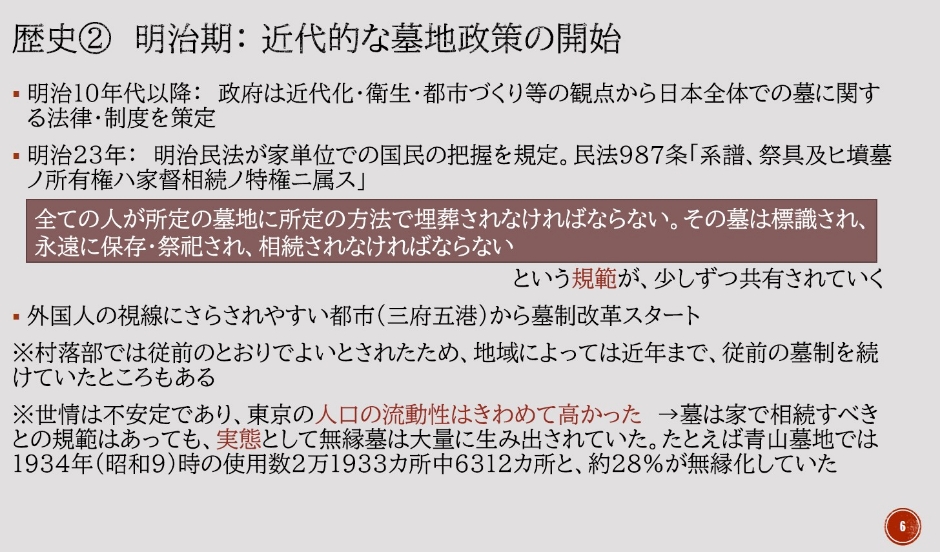 それが明治期には近代的な墓地政策が始まります。近代化、衛生、都市づくりといった観点から、お墓の法律が作られていきます。また、明治民法で、お墓は家で代々継いでいくことが定められました。ただし重要なのは、こうした規範は「いっせいのせ」で全国的に変わったわけでは決してなくて、むしろ村落部は今までのやり方でもいいとされました。しかし都市部では、法律に則ったやり方にどんどん変えていくものとされ、都市部から墓地の近代化が進められていきます。とは言っても、東京のように、人口の流動性が非常に高い都市部においては、実態として墓をしっかりと家で代々継いでいくことは難しく、無縁墓が大量に生み出される状況がしばらく続きました。