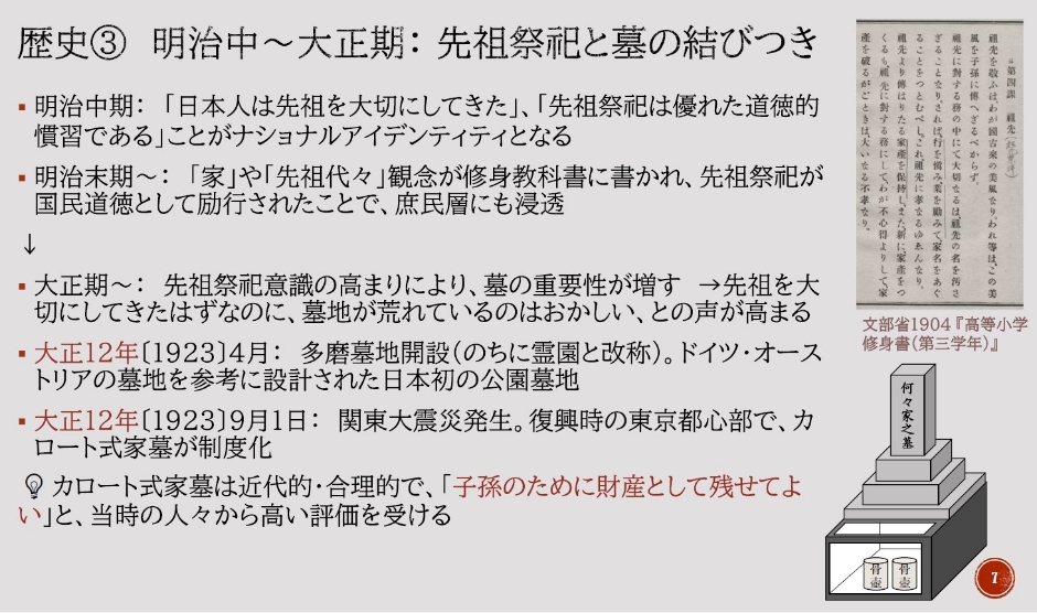 次に先祖について少しお話ししますと、明治中期頃から、日本人は先祖を大切にする民族だというナショナルアイデンティティが少しずつ形成されていきます。教科書の中にも、祖先を敬うのは我が国古来の美風であると書かれるようになり、先祖を祀ることが国民的な道徳として励行されます。大正期頃には、先祖祭祀の意識が高まっていくことによって、お墓もどんどん整えられます。大正末期、今からちょうど100年前に、多磨墓地、今の多磨霊園が造られました。しかし半年も経たないうちに関東大震災が発生してしまい、東京の都心部の墓地がぐちゃぐちゃになってしまいました。その都市復興のなかで、カロート式のお墓が制度化されます。カロート式のお墓は非常に近代的、合理的な墓制として当初スタートしたんですね。人々としても、このように墓を建てておけば子孫のために財産としてこのお墓を残すことができると。子どもに迷惑をかけないためのお墓として高い評価を得て、当時は普及しました。