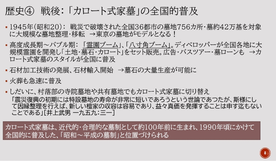 時代をどんどん進めますが、このようなカロート式のお墓が東京で普及し、戦後になると全国的にも広がります。戦災復興で、東京の墓地がモデルとなって急速に普及していきました。高度成長期からバブル期にかけて、人口が増えるに従って墓地の需要も高まり、このあたり詳しくは割愛しますが、石材加工技術、そして火葬の普及もあって、霊園が普及しました。我々が見慣れた、同じ形の石が立ち並ぶこの霊園の光景が全国的に見られるようになりました。