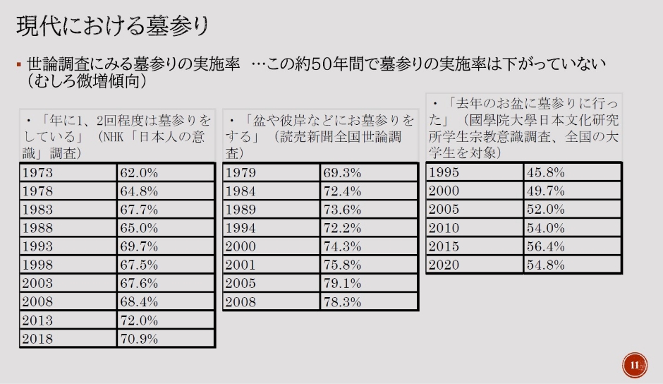 そして家族連れ立っての墓参りの実施率も高まります。世論調査などを見ますと、むしろ1970年代頃と比べて2000年代、2010年代には、墓参りの実施率は少し上がっているようです。お墓参りは、現在7割ほどの方々が行う慣習になっています。