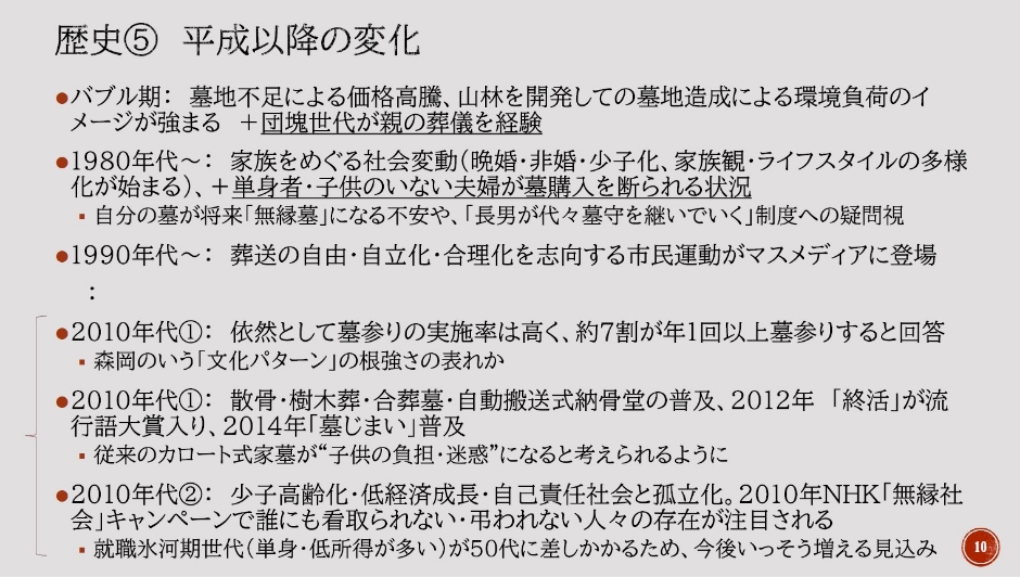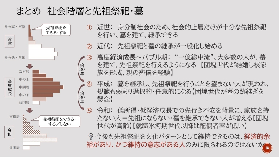 最後に、簡単にまとめさせていただきます。このイメージ図のように、もともと近世においては、身分制社会のために、お墓を中心とした先祖祭祀をすることができる方は、ごく一部の方々でした。社会的上層の方々だけが十分に先祖祭祀を行なうことができていた。それが近代になると、先祖祭祀やお墓の継承が一般化し始め、さらに国の経済発展とともに、実際に現実化したのが高度経済成長からバブル期にかけてでした。一億総中流社会の中で、大多数の人がお墓を買って、先祖祭祀を十全に行えるようになりました。しかし、平成になった頃から、それをできたとしても望まない人たちも現れ始め、先祖祭祀の実施が選択的になっていく。令和時代になると、今度は低所得、低経済成長で先行きの不安を背景に、家族を持たない人、先祖にならない人、墓を継承できない人が、増えていくのでないかと思われます。このように、冒頭でご紹介した森岡先生の指摘に加えて、先祖祭祀を「文化パターン」として維持することができるのは、経済的な余裕があってなおかつ、その先祖祭祀を維持していきたい意思があること、この2つが条件となって維持しうる。先祖祭祀はどんどん弱まっていく傾向はやはり否めないのではないか、これが私の話の結論となります。ありがとうございました。