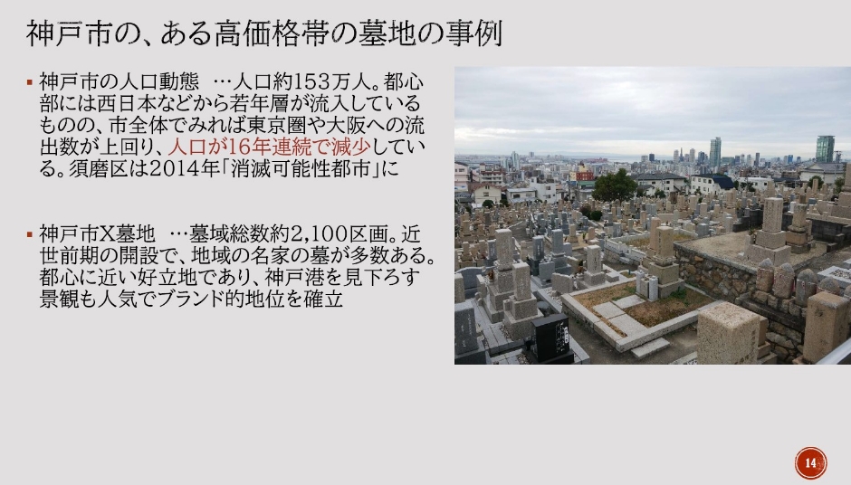 こうした大きな傾向をもとに、最後に短い時間ですが、わたくしのフィールドワークをご紹介させていただいて、しめくくりにします。神戸市の墓地についてです。実は神戸市は政令指定都市ではありますが、人口の流出数が流入数を上回っており、人口は減少傾向にございます。ただその中でも、今回ご紹介する墓地は、近世前期に開設され、地域の名家のお墓がたくさんある墓地で、都心に近いこともあってブランド的な地位を確立している、高価格帯の墓地として事業展開されている墓地です。