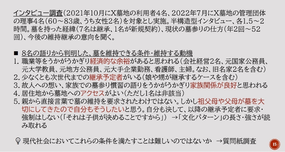 昨年私は、この墓地にあるお墓をこれからも継いでいく意思の比較的強いと思われる方々8名にインタビューをさせていただいたところ、墓を維持しようという方に共通する条件や、維持する動機について、5つの共通点を見つけることができました。1つは、ご職業等を伺う限り、経済的な余裕があると思われる方々であること。2つめに、少なくとも次世代までの継承予定者がいらっしゃること。お子さんがいらっしゃらない方でも、甥っ子の方が継承することが約束できている方も含みます。3つめに、故人への想いや、墓参り慣習といったお話を伺うことで、ご家族の関係が非常に良好な方々だとわかりました。4つめ、8名のうち1名を除く7名は、居住地から墓地へのアクセスが良く、皆さんかなり高頻度で墓参りをしている。最後の5つめのポイントは、親から「お墓を維持しなさい」と規範的に要求された経験はなく、しかし祖父母や父母が大切にしてきたのを見ていて、自分の大事な祖父母や父母が大事にしてきたものを自分も大事にしていきたいと、そういう意思がおありでした。そして自分も子供たちに「この墓を継いでね」と義務づけることはせず、「それは子どもが決めることですから」とおっしゃる。こうした形で、お墓を維持していらっしゃることがわかりました。ただ、この5つを条件とした場合に、これらを全て満たすことは、非常に難しいのではないかと思われました。