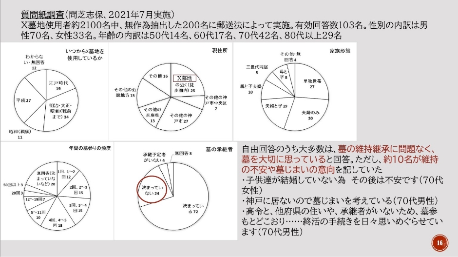 なお、その墓地の利用者の方々を対象に、郵送法によって質問紙調査を行なった結果がこちらになります。時間の関係で詳細は省きますが、全体としては、お墓をこれからも維持できるとか、墓を大切に思っている方々が多かった一方、103名に回答をいただいたうち10名ほどが、維持の不安とか、もう墓じまいするつもりですとの意向を示されていました。やはり、継承者が決まっていない方も決して少なくなかったわけです。この結果を見るに、全ての条件を満たしてこれからも墓を維持していくことは、必ずしも自明のことではなく、今後はどんどん難しくなっていくと思われました。